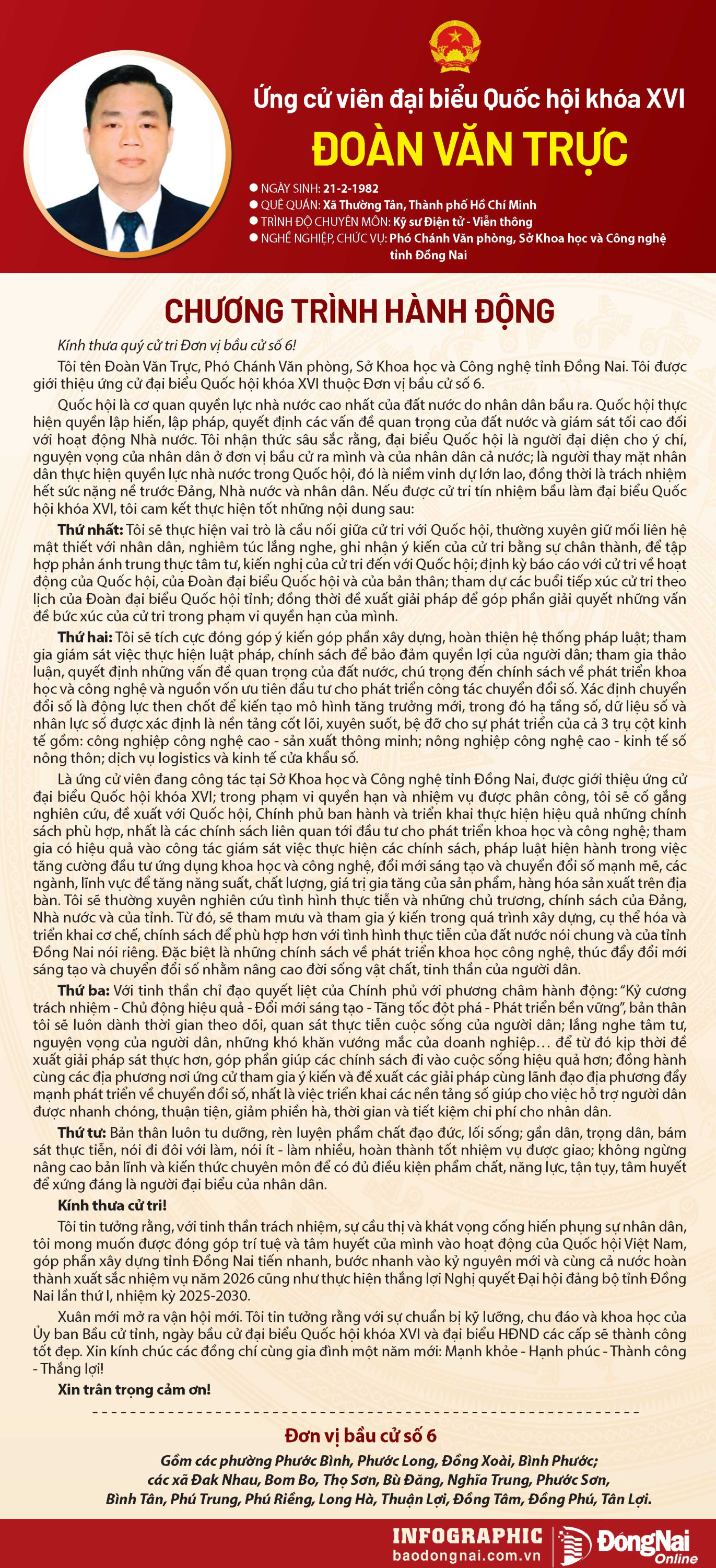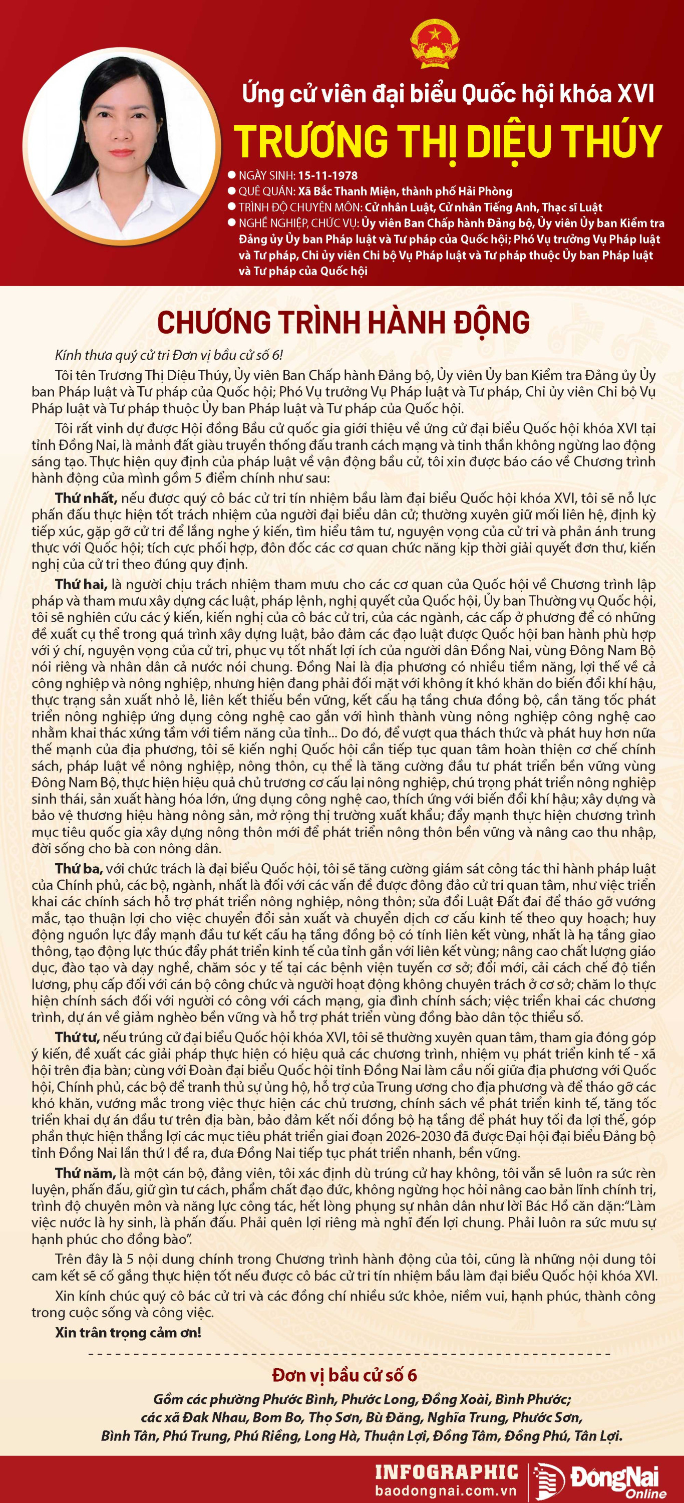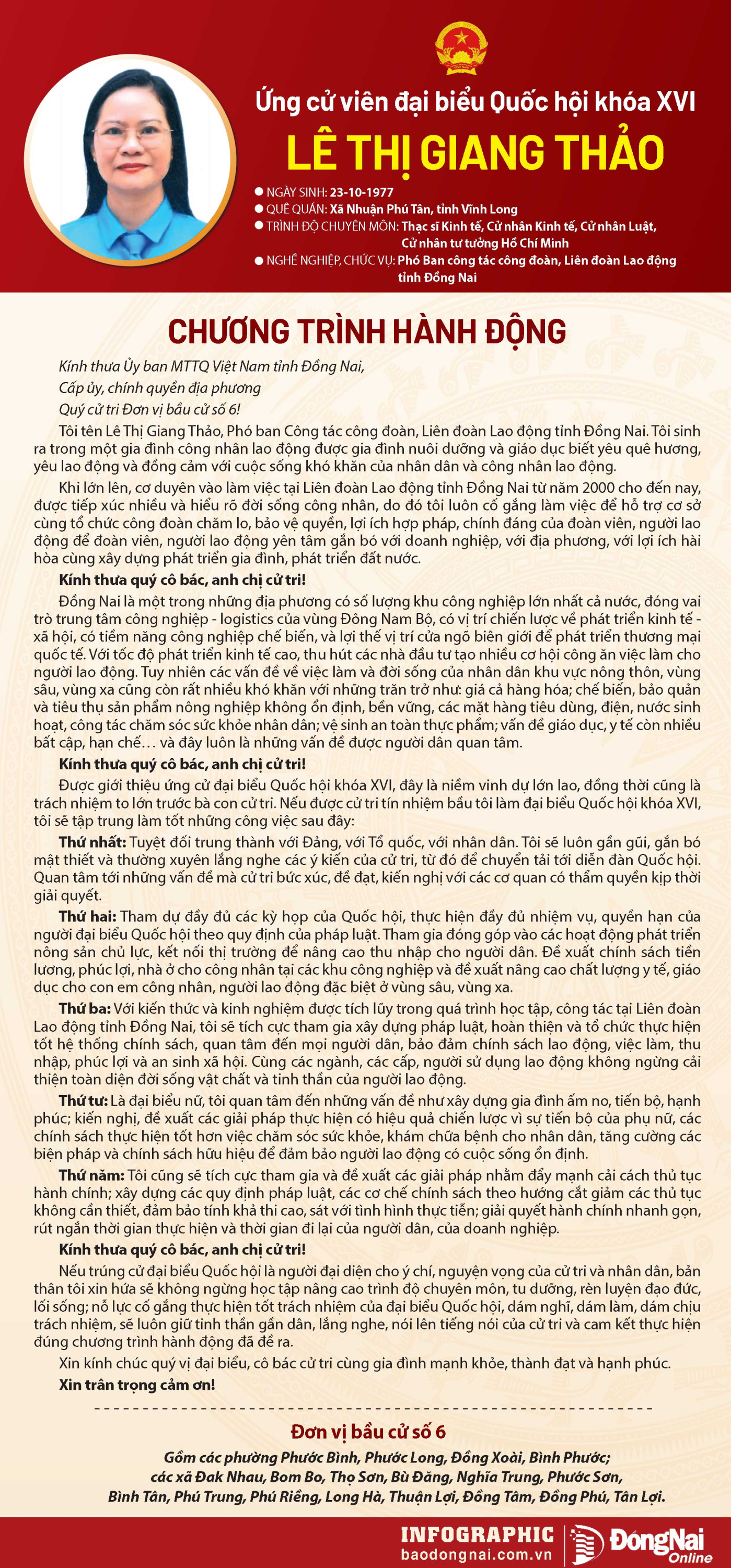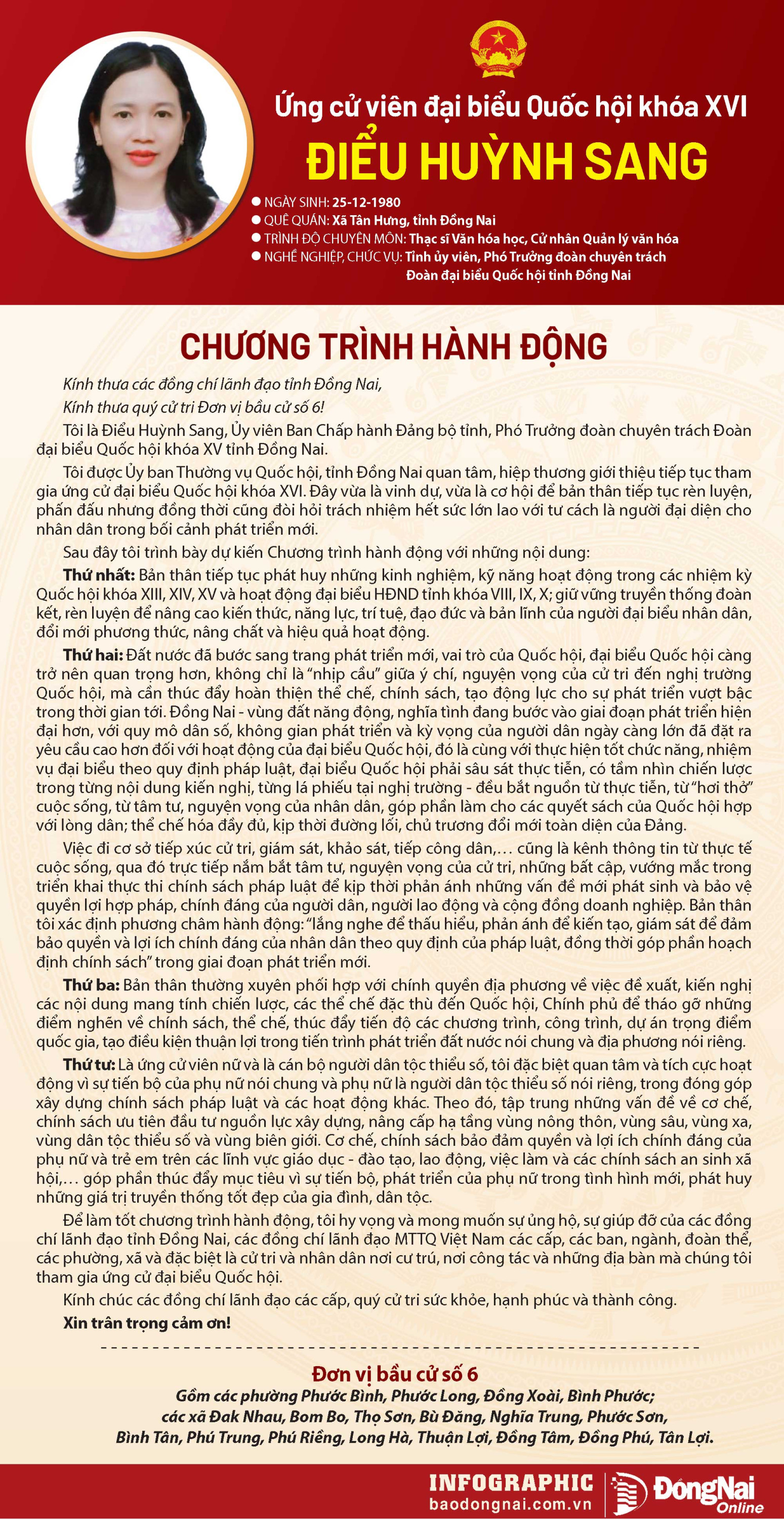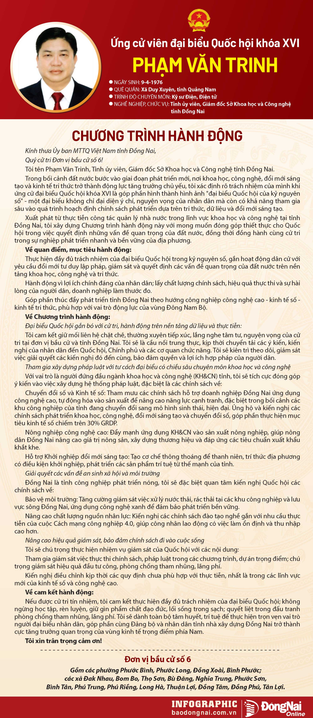 Báo và Phát thanh, Truyền hình Đồng Nai trân trọng giới thiệu chương trình hành động của ứng cử viên đại biểu Quốc hội khóa XVI tới bạn đọc.