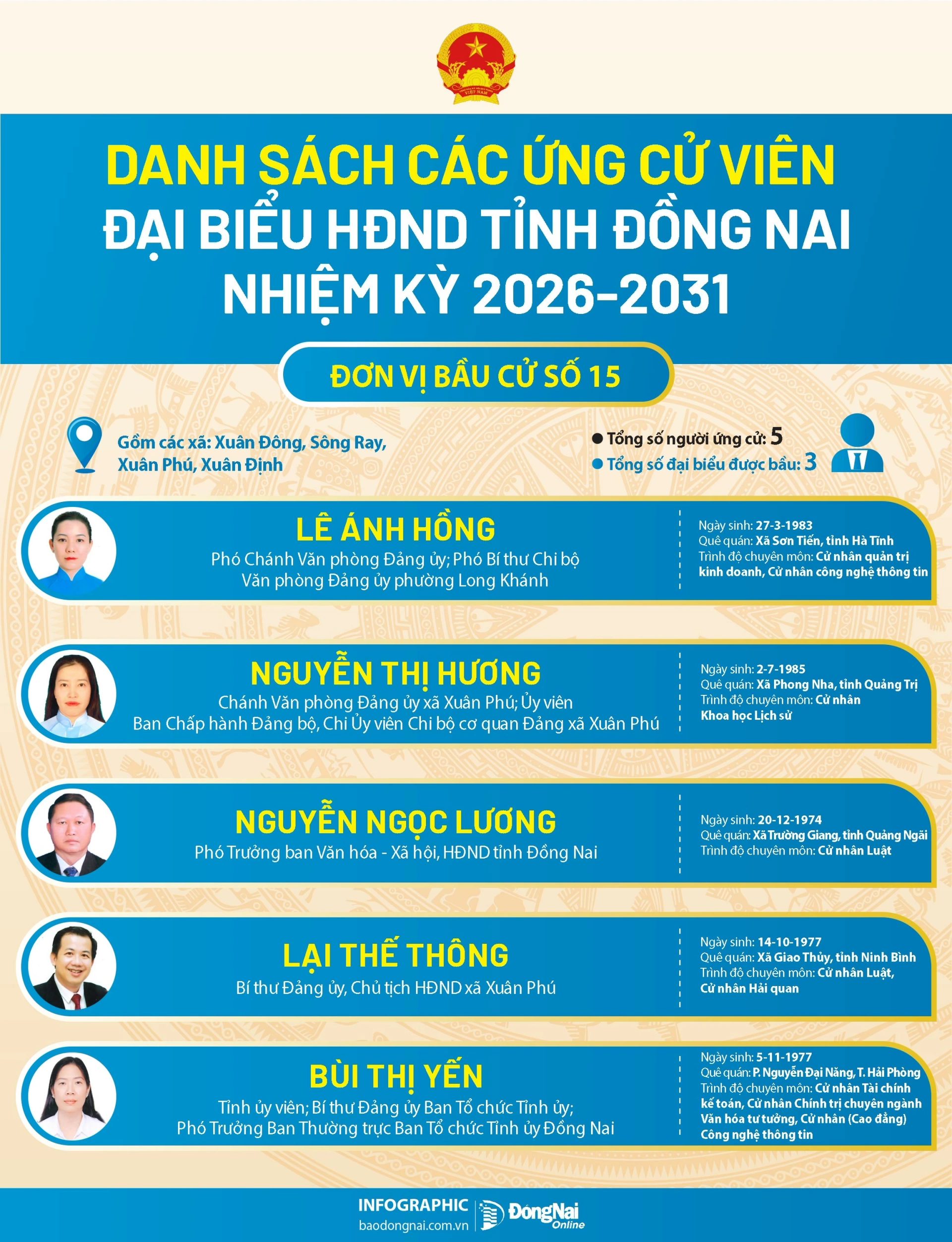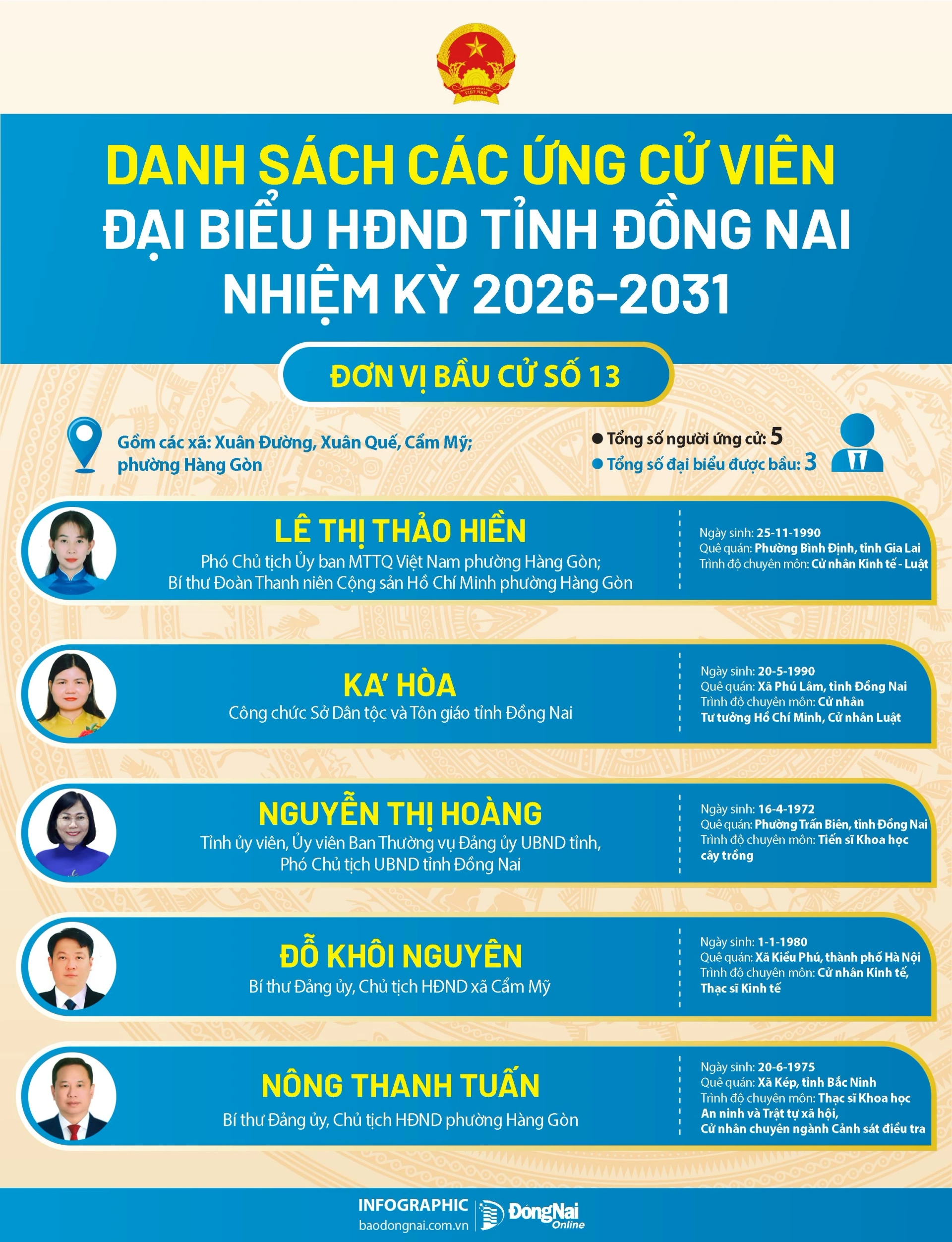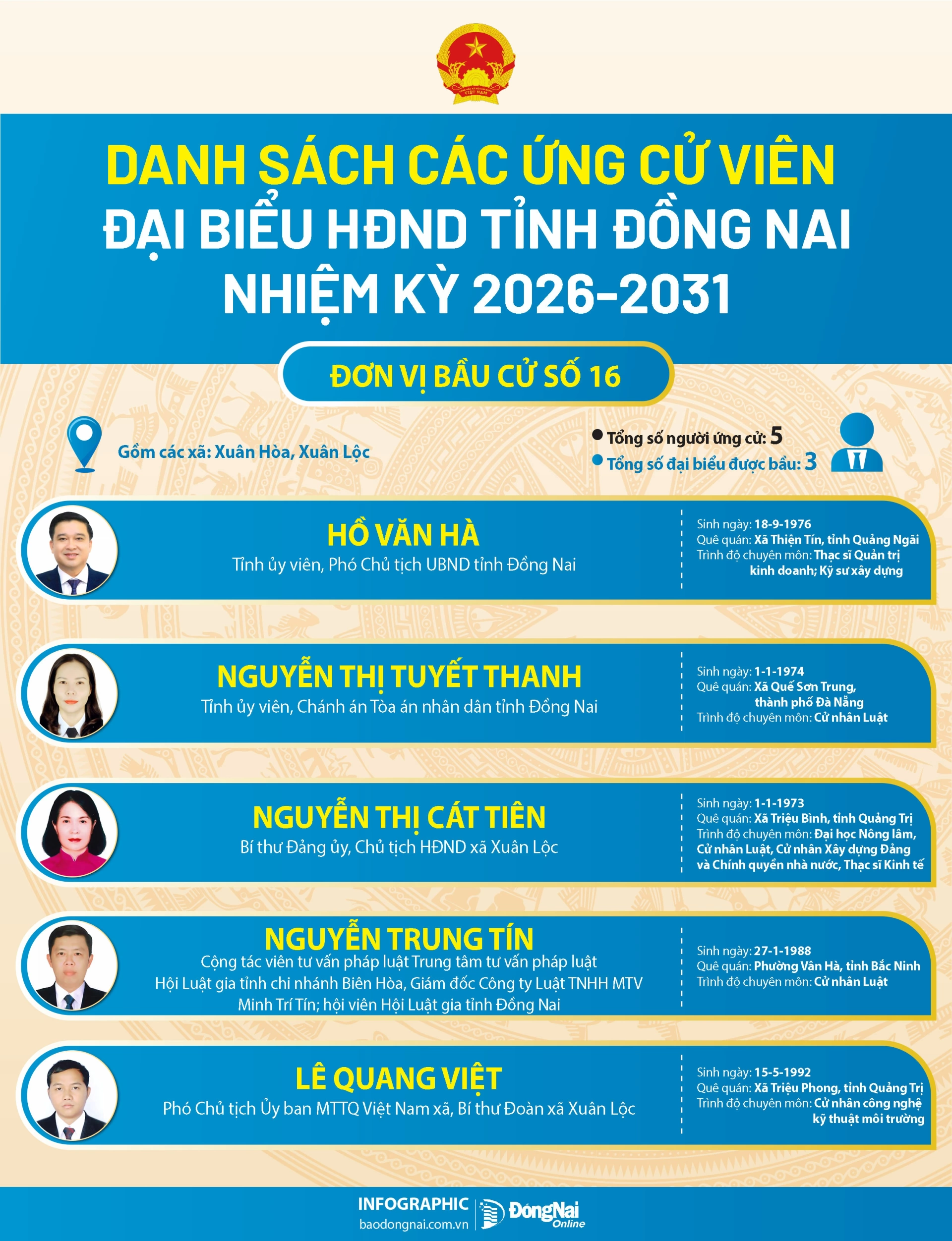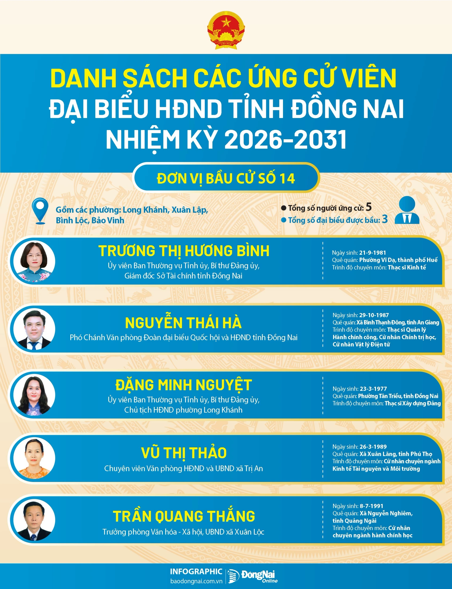Báo và Phát thanh, Truyền hình Đồng Nai trân trọng giới thiệu danh sách ứng cử viên đại biểu HĐND tỉnh nhiệm kỳ 2026-2031 - các đơn vị bầu cử số 13, 14, 15, 16 tới bạn đọc.