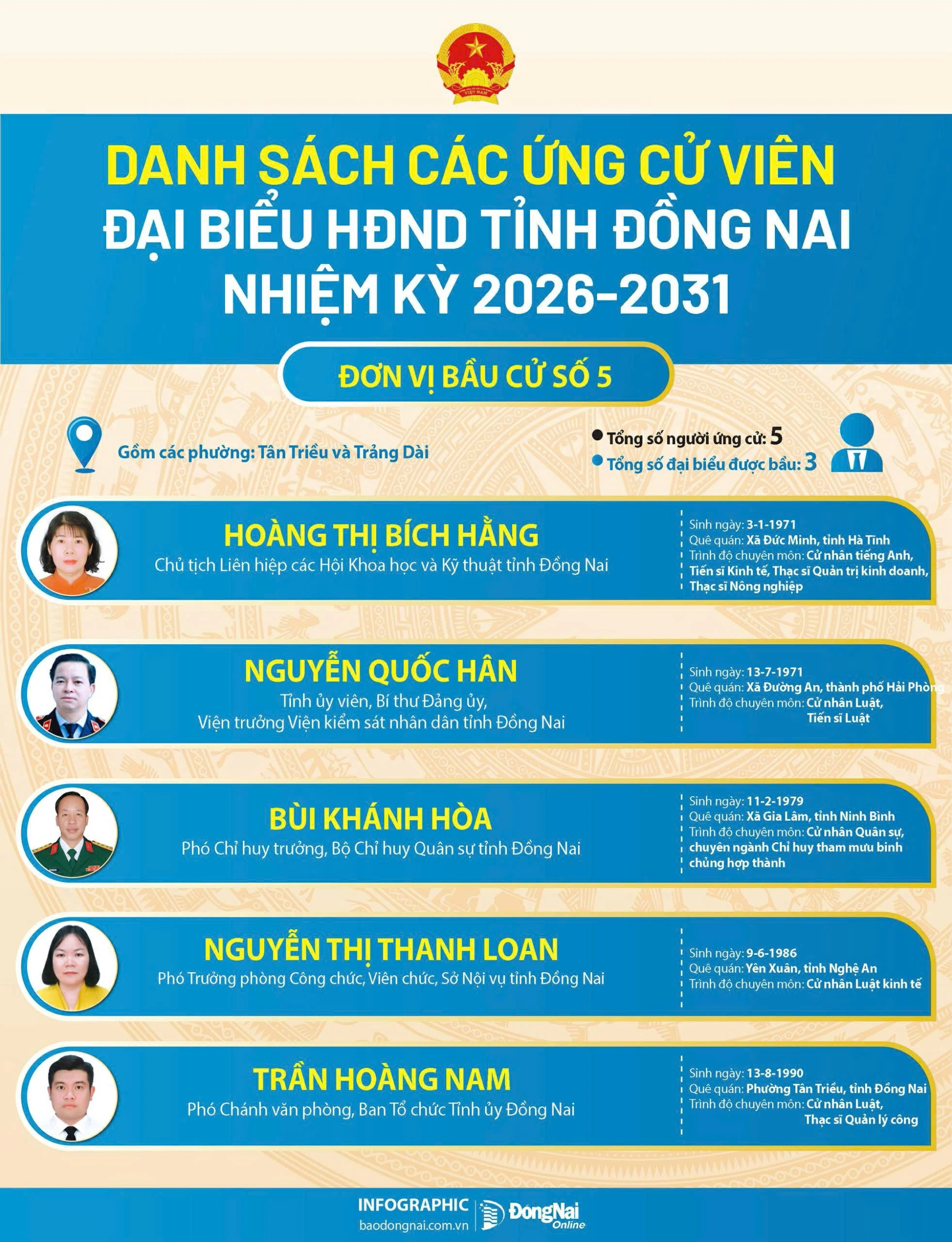 Báo và Phát thanh, Truyền hình Đồng Nai trân trọng giới thiệu danh sách ứng cử viên đại biểu HĐND tỉnh nhiệm kỳ 2026-2031 - các đơn vị bầu cử số 5, 6, 7, 8 tới bạn đọc.