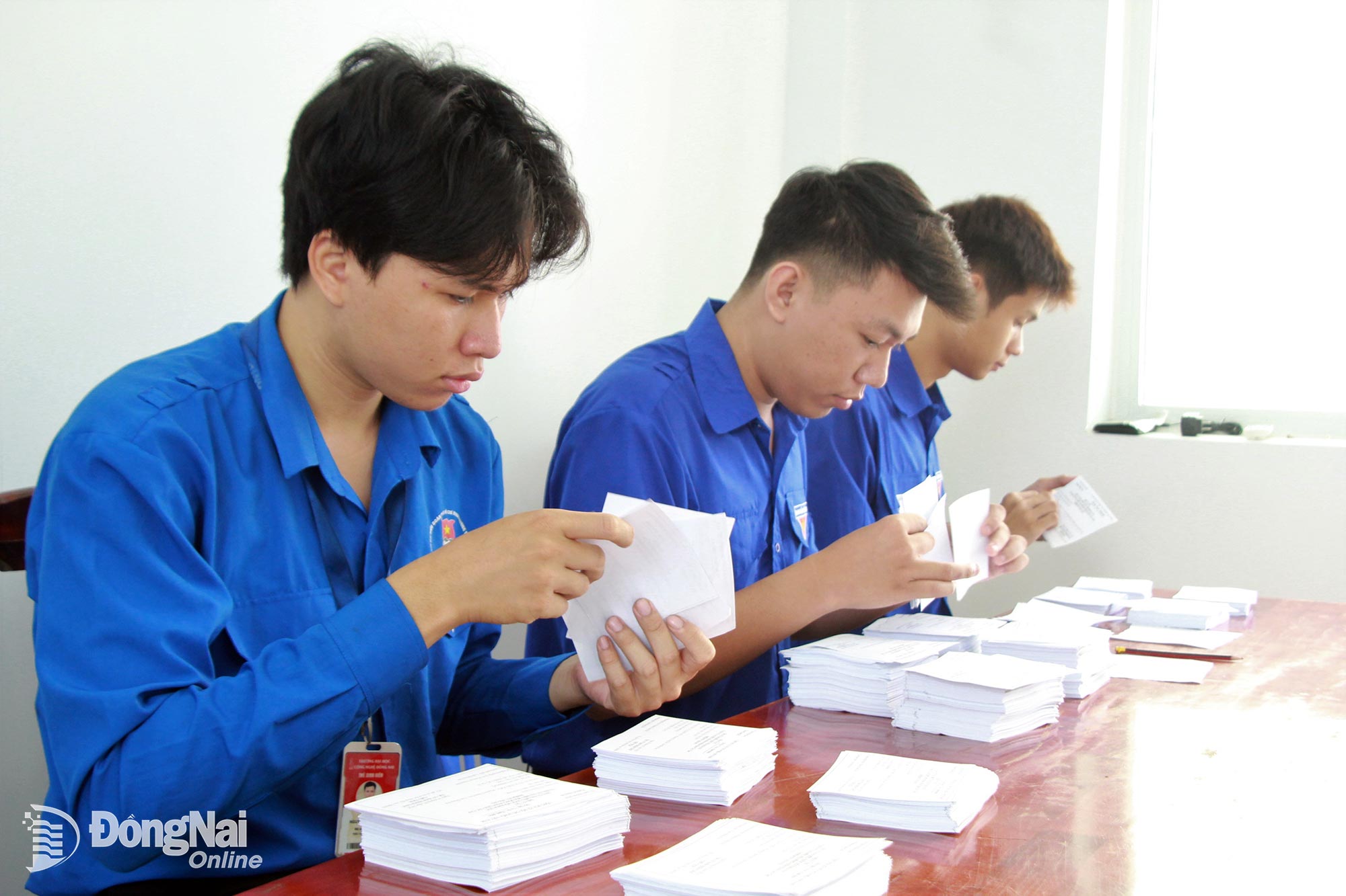 Sinh viên Trường đại học Công nghệ Đồng Nai hỗ trợ phân loại thẻ cử tri tại Ủy ban Bầu cử phường Trảng Dài. Ảnh: Nga Sơn