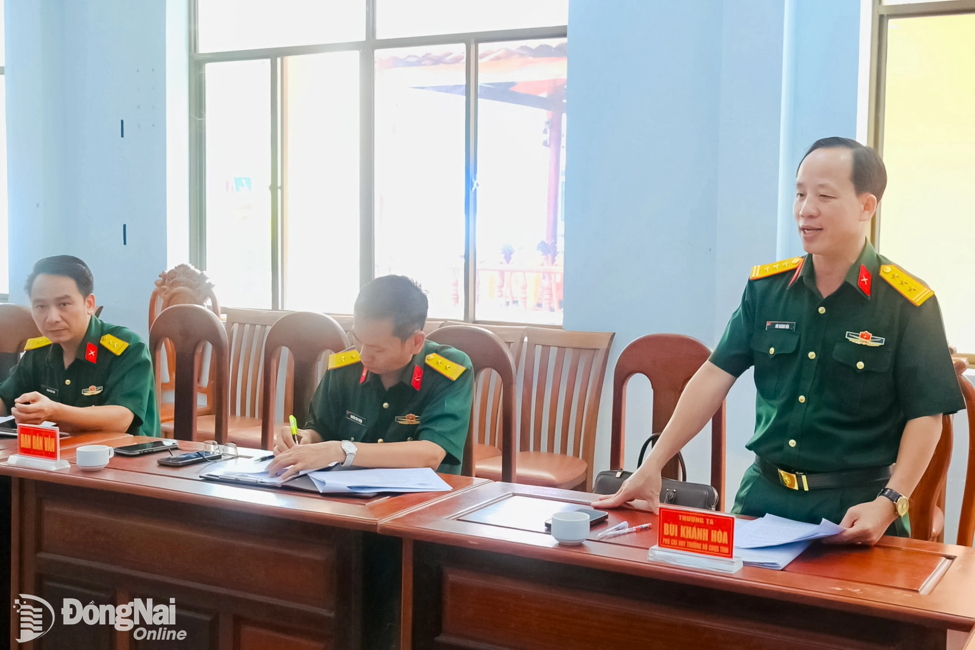 Thượng tá Bùi Khánh Hòa, Phó Chỉ huy trưởng Bộ Chỉ huy Quân sự tỉnh báo cáo công tác chuẩn bị bầu cử của đơn vị. Ảnh: Văn Chung