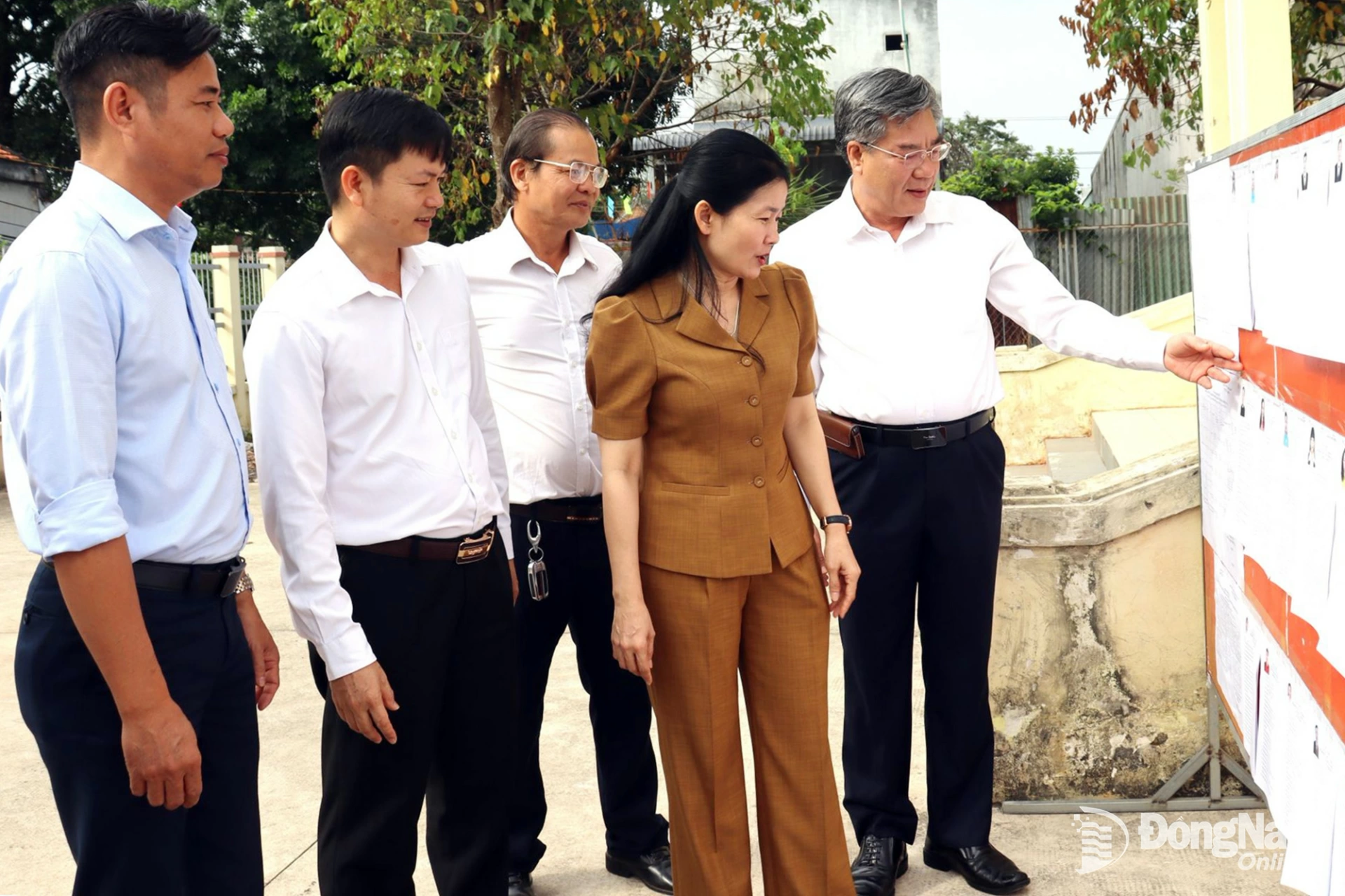 Ủy viên Trung ương Đảng, Phó Bí thư Thường trực Tỉnh ủy, Chủ tịch HĐND tỉnh, Phó Chủ tịch Ủy ban Bầu cử tỉnh Tôn Ngọc Hạnh kiểm tra khu vực niêm yết danh sách, tiểu sử của các ứng cử viên ở một điểm bầu cử tại xã Tân Lợi. Ảnh: Nguyệt Hà
