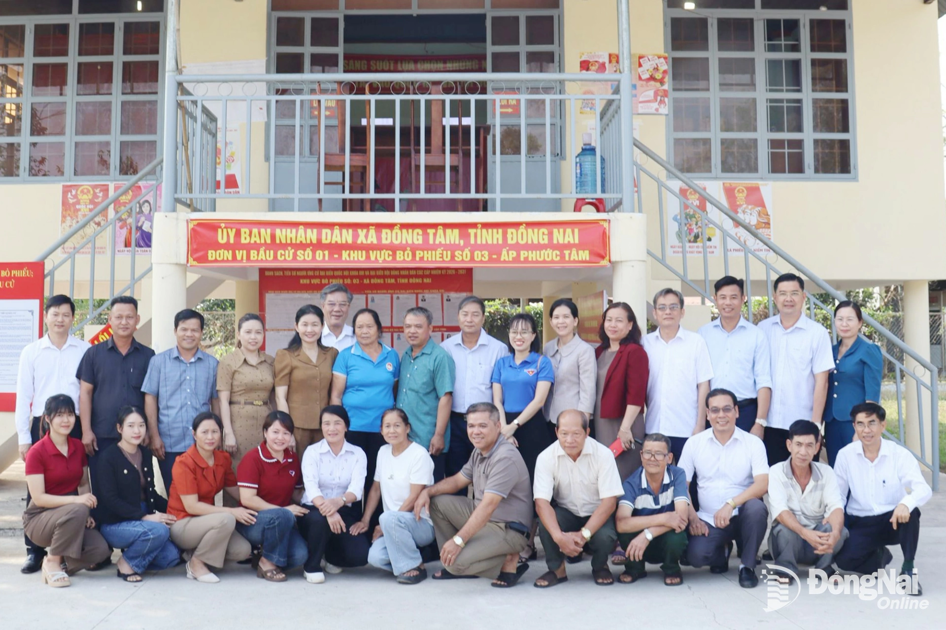 Đoàn công tác chụp hình với thành viên tổ bầu cử xã Đồng Tâm. Ảnh: Nguyệt Hà
