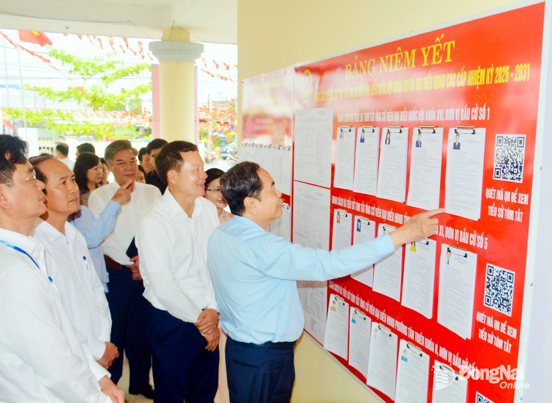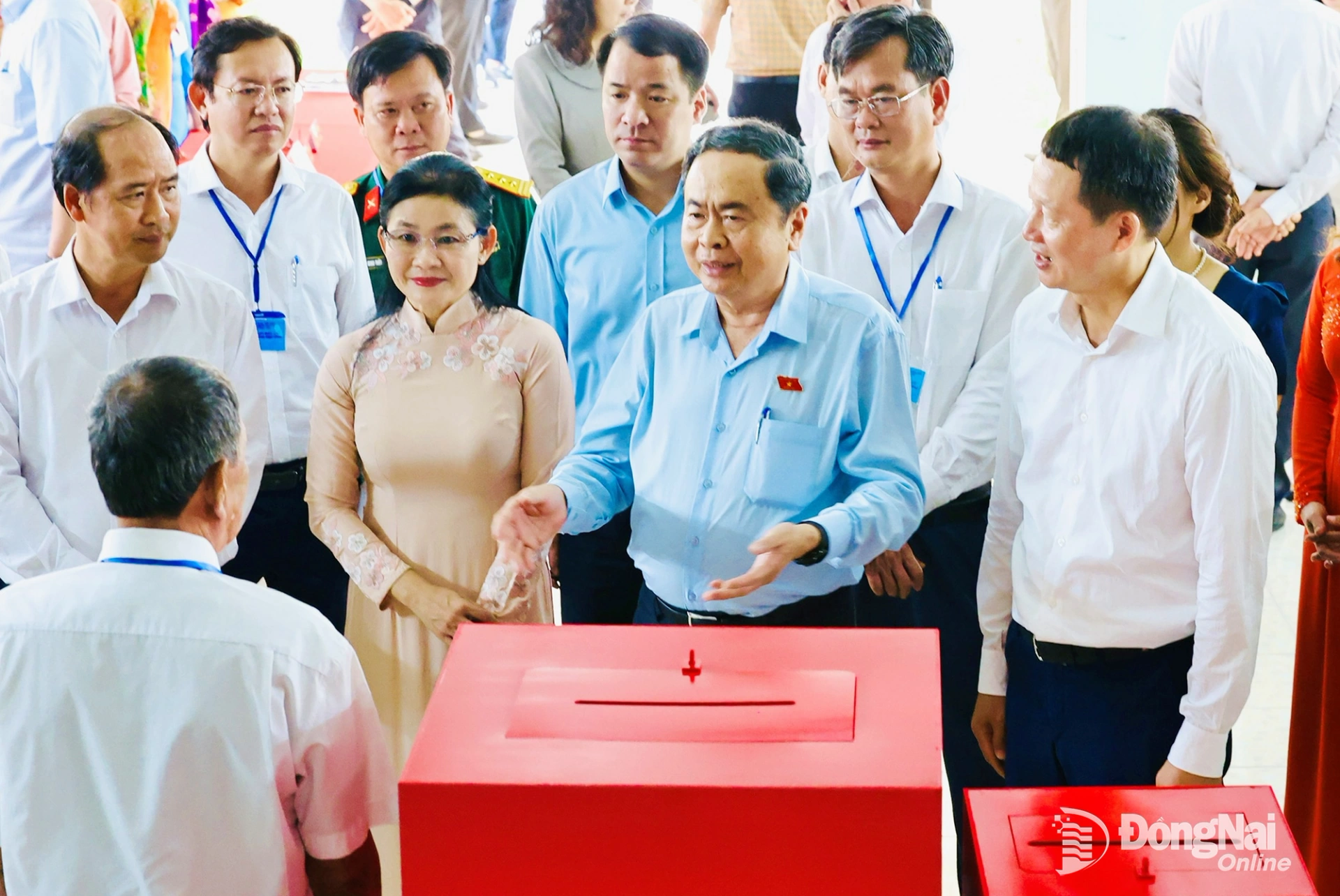 Đồng chí Trần Thanh Mẫn, Ủy viên Bộ Chính trị, Chủ tịch Quốc hội, Chủ tịch Hội đồng Bầu cử quốc gia cùng đoàn công tác kiểm tra thực tế tại khu vực bỏ phiếu số 17, phường Tân Triều. Ảnh: Công Nghĩa