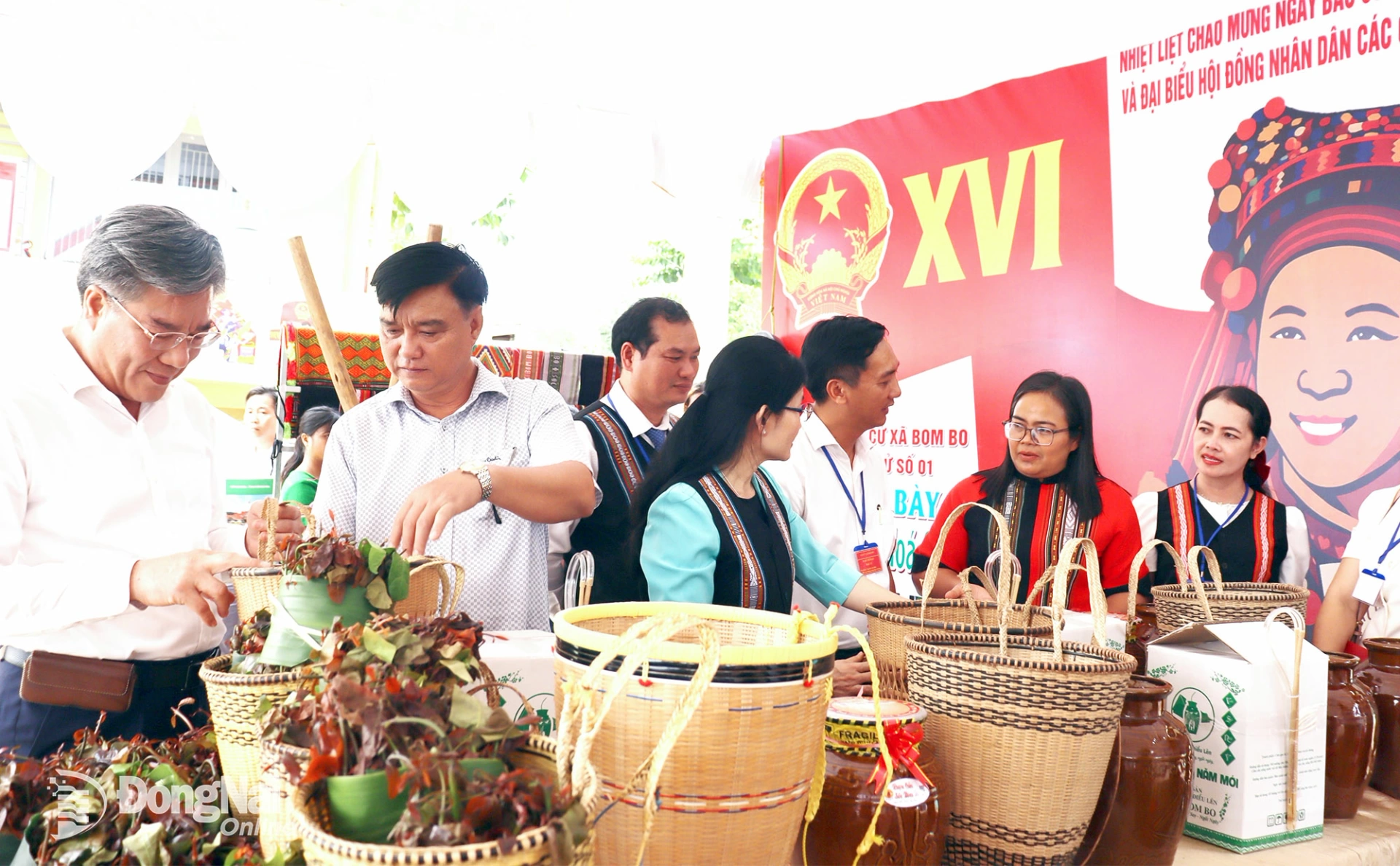 Lãnh đạo tỉnh tham quan khu trưng bày các sản phẩm của đồng bào dân tộc thiểu số tại một khu vực bầu cử ở xã Bom Bo. Ảnh: Nguyệt Hà