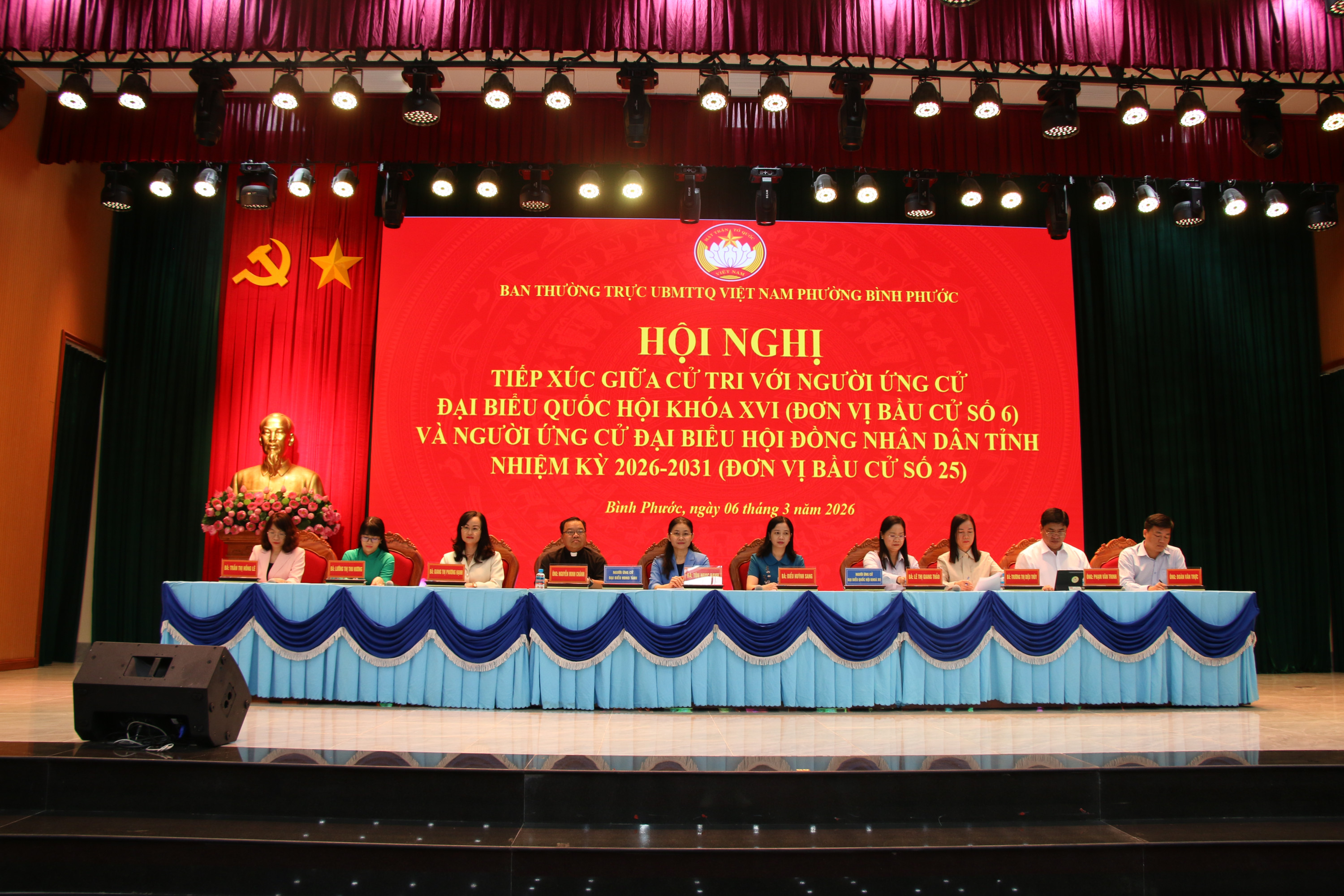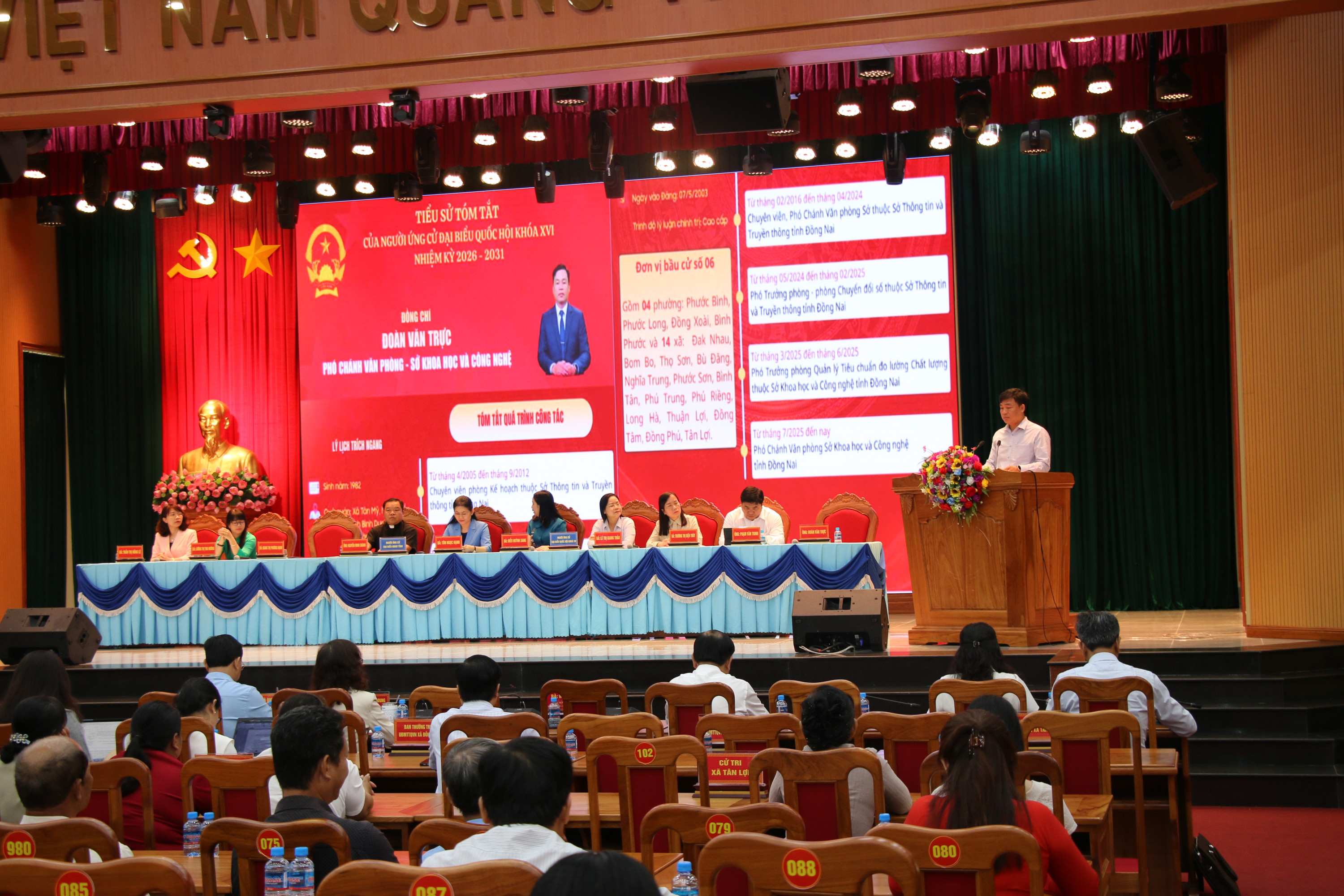 Đơn vị bầu cử số 6, các ứng cử viên đại biểu Quốc hội khóa XVI tỉnh Đồng Nai gồm: bà Điểu Huỳnh Sang, Tỉnh ủy viên, Phó Trưởng đoàn chuyên trách Đoàn đại biểu Quốc hội tỉnh Đồng Nai; bà Lê Thị Giang Thảo, Phó Ban Công tác Công đoàn, Liên đoàn Lao động tỉnh Đồng Nai; bà Trương Thị Diệu Thúy, Phó Vụ trưởng Vụ Pháp luật và Tư pháp thuộc Ủy ban Pháp luật và Tư pháp của Quốc hội; ông Phạm Văn Trinh, Tỉnh ủy viên, Giám đốc Sở Khoa học và Công nghệ tỉnh Đồng Nai; ông Đoàn Văn Trực, Phó Chánh Văn phòng Sở Khoa học và Công nghệ tỉnh Đồng Nai. Đơn vị bầu cử số 25, các ứng cử viên đại biểu HĐND tỉnh Đồng Nai gồm: bà Tôn Ngọc Hạnh, Ủy viên Ban Chấp hành Trung ương Đảng, Phó Bí thư Thường trực Tỉnh ủy, Chủ tịch HĐND tỉnh Đồng Nai; bà Giang Thị Phương Hạnh, Ủy viên Ban Thường vụ Tỉnh ủy, Bí thư Đảng ủy, Chủ tịch HĐND phường Bình Phước; ông Nguyễn Minh Chánh, Linh mục Chánh sứ An Khương, Phó Chủ tịch Thường trực Ủy ban Đoàn kết Công giáo Việt Nam tỉnh Đồng Nai; bà Trần Thị Hồng Lê, Phó Trưởng phòng Ban Nội chính Tỉnh ủy tỉnh Đồng Nai; bà Lường Thị Thu Hương, công chức xã Lộc Ninh. |