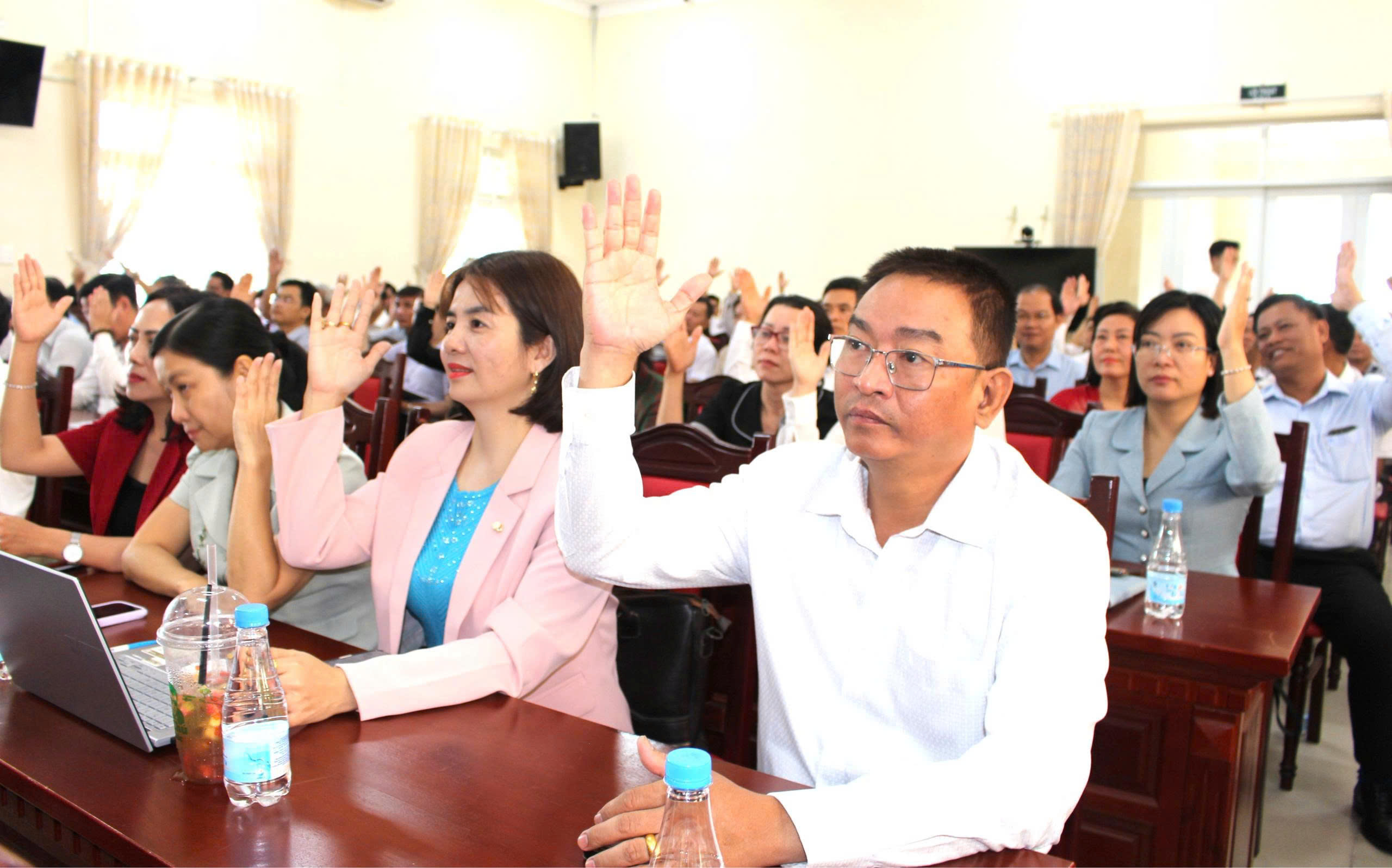 Đại biểu dự Hội nghị Hiệp thương lần thứ hai biểu quyết thống nhất cao danh sách 150 ứng cử viên đại biểu HĐND tỉnh nhiệm kỳ 2026-2031 (Ảnh: Hiếu Thanh)