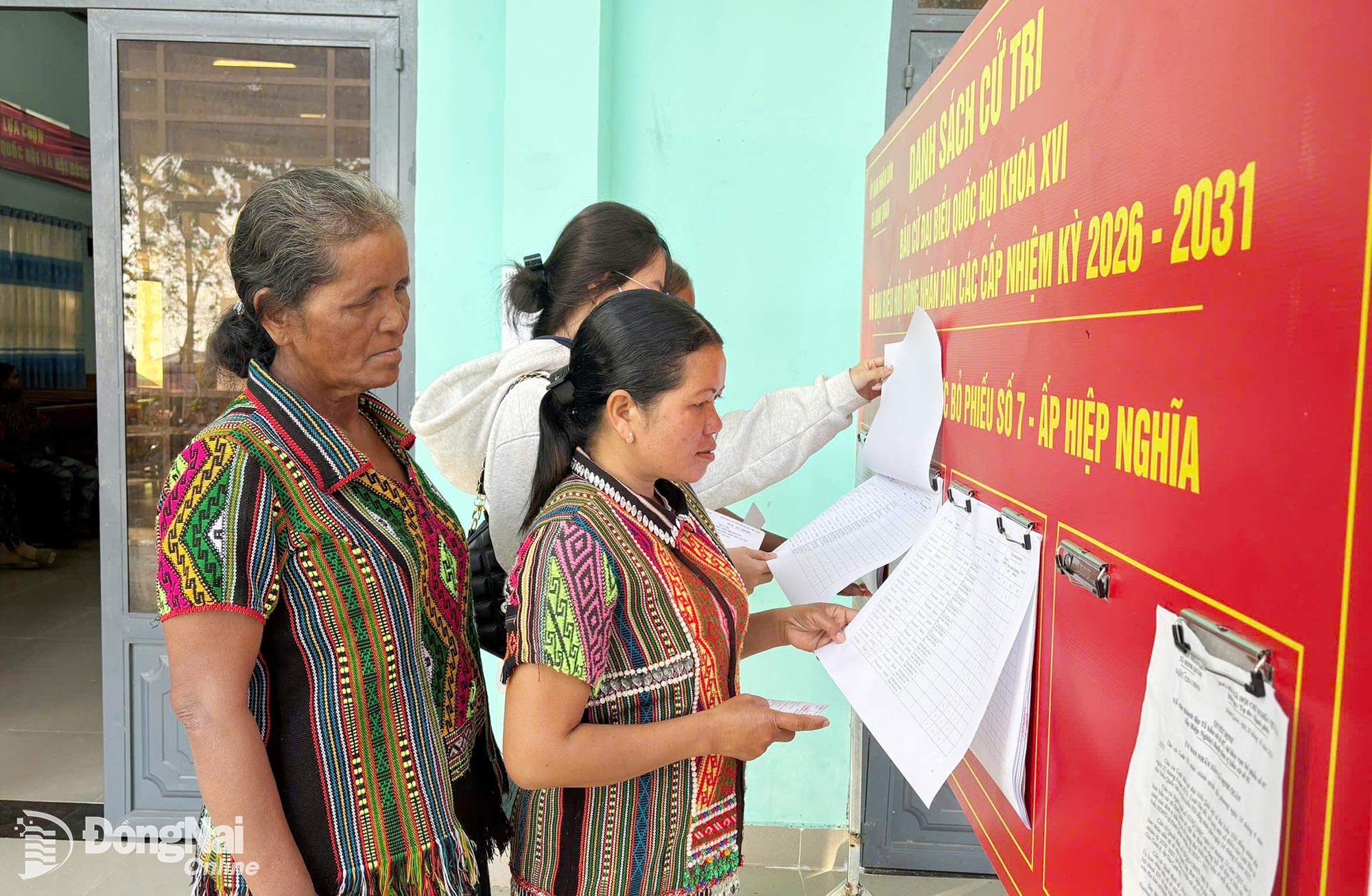 Các cử tri là đồng bào dân tộc thiểu số xem danh sách cử tri tại Khu vực bỏ phiếu số 7 - ấp Hiệp Nghĩa, xã Định Quán. Ảnh: Đan Nhi
