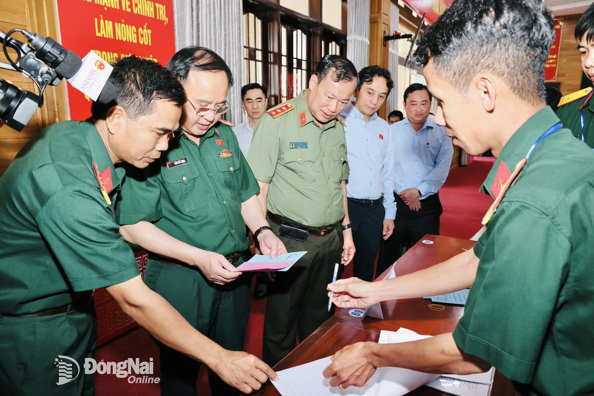 Đoàn kiểm tra, giám sát khảo sát thực tế khu vực bỏ phiếu số 38 tại Bộ Chỉ huy Quân sự tỉnh. Ảnh: Công Nghĩa