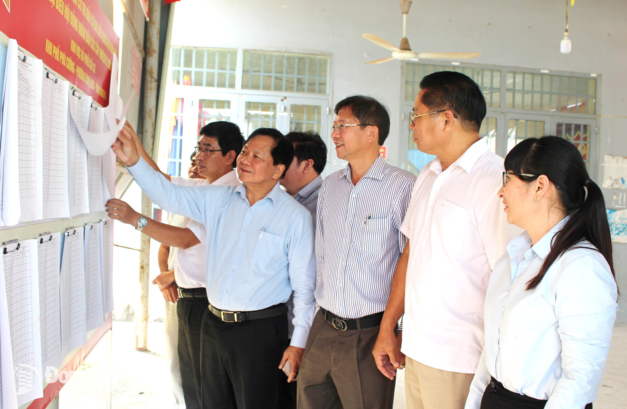Tỉnh ủy viên, Phó Chủ tịch HĐND tỉnh Trần Văn Mi cùng thành viên đoàn giám sát và lãnh đạo phường Bình Long kiểm tra việc niêm yết danh sách cử tri trên địa bàn. Ảnh: Hồ Thảo