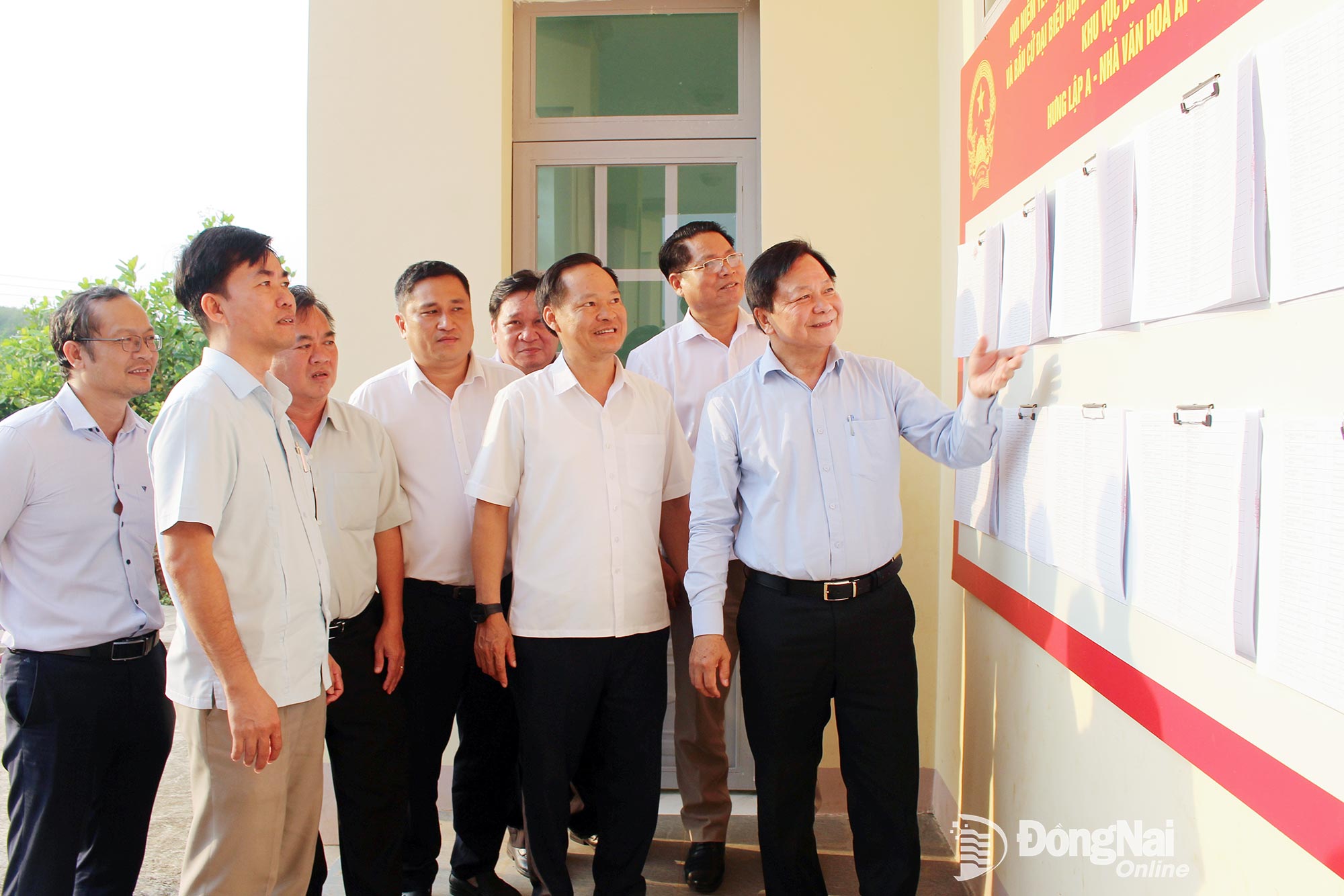 Tỉnh ủy viên, Phó Chủ tịch HĐND tỉnh Trần Văn Mi cùng thành viên đoàn giám sát và lãnh đạo xã Tân Hưng khảo sát một điểm niêm yết danh sách cử tri trên địa bàn xã. Ảnh: Hồ Thảo