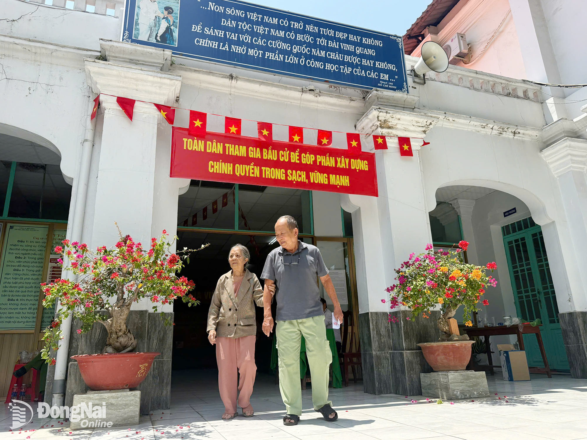 Sáng 15-3, ông Ngô Minh Quang nắm tay bà Trương Thị Huệ chậm rãi bước vào khu vực bỏ phiếu. Thấy ông bà đến gần cửa, các cán bộ phục vụ bầu cử nhanh chóng ra hỗ trợ bước lên bậc thềm. Nhưng ông vui vẻ từ chối, nói rằng mình vẫn còn đi lại tốt.