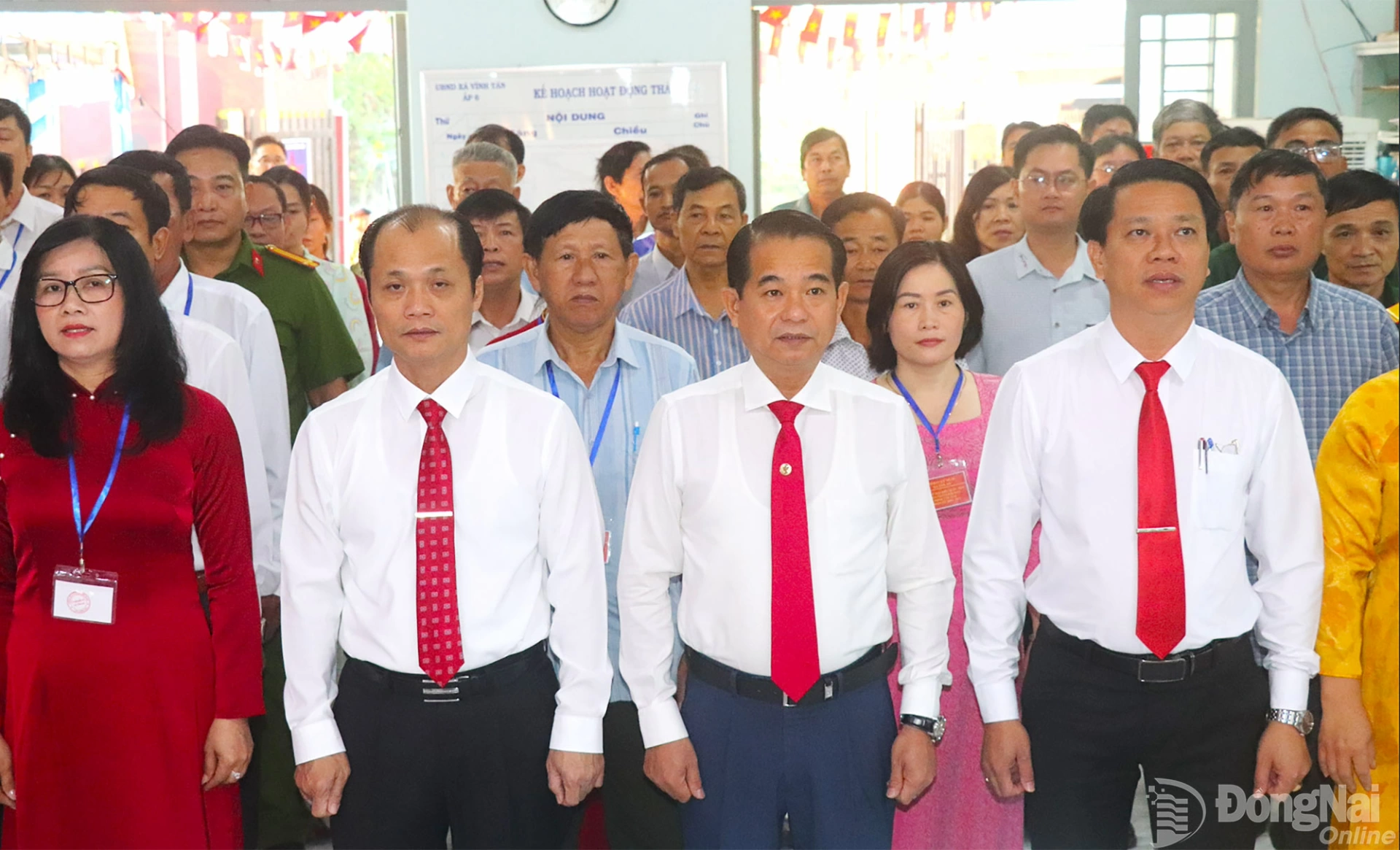 Đồng chí Thái Bảo, Phó Bí thư Tỉnh ủy, Trưởng ban Tổ chức Tỉnh ủy, Phó Chủ tịch Ủy ban Bầu cử tỉnh Đồng Nai cùng lãnh đạo tỉnh, địa phương và các tầng lớp nhân dân dự lễ khai mạc bầu cử tại Khu vực bỏ phiếu số 10. Ảnh: An Nhơn