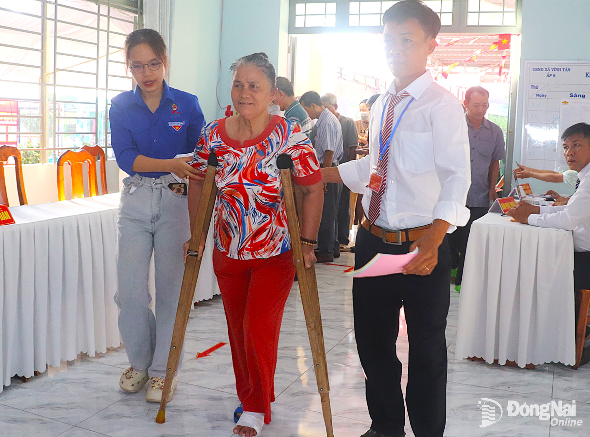 Một phụ nữ bị thương ở chân nhưng sẵn sàng tham gia thực hiện quyền và nghĩa vụ công dân của mình. Ảnh: An Nhơn