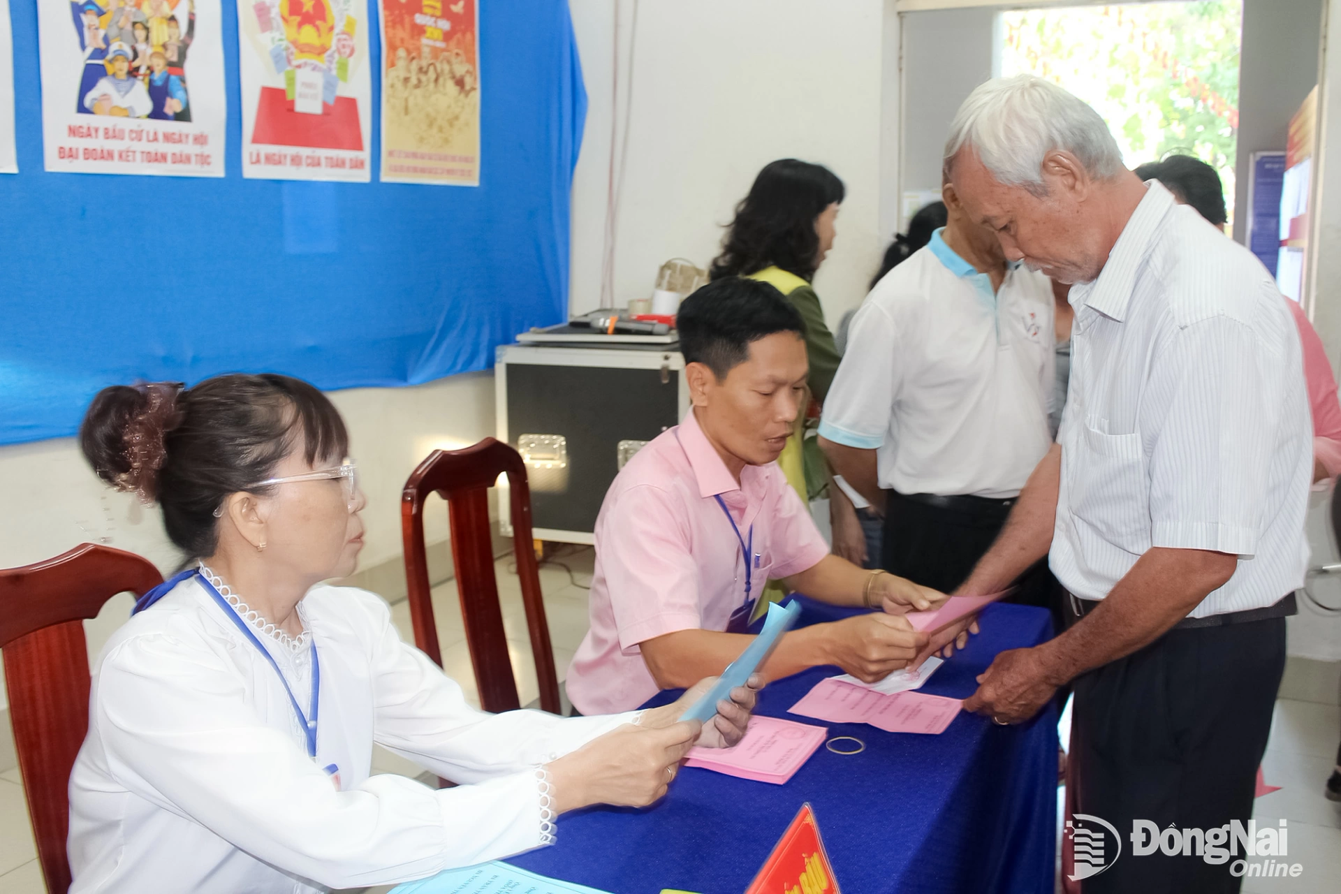Các cử tri nhận phiếu bầu cử tại khu vực bỏ phiếu số 2, phường Long Hưng. Ảnh: Nguyễn Hòa