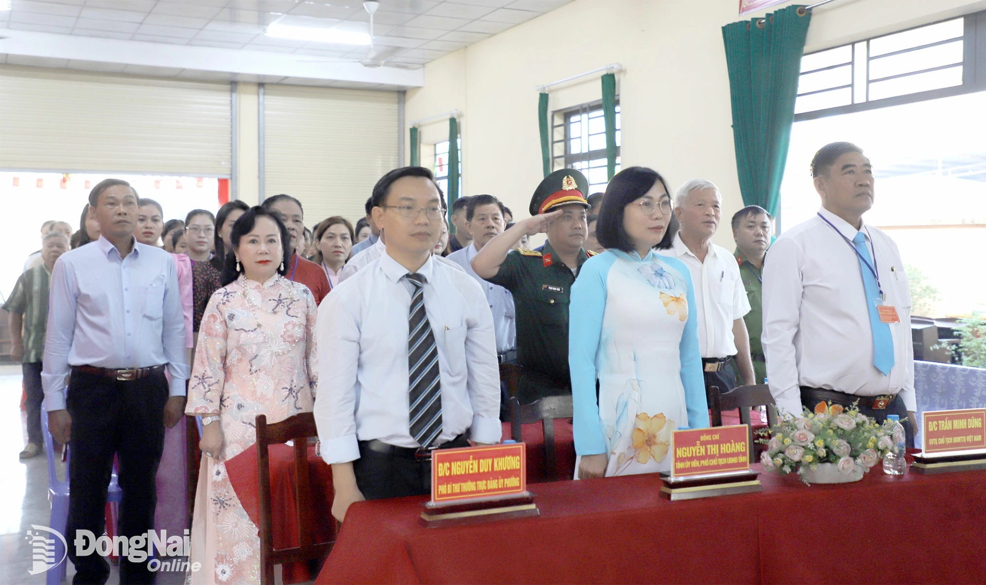 Tỉnh ủy viên, Phó Chủ tịch UBND tỉnh Nguyễn Thị Hoàng và các đại biểu, cử tri thực hiện nghi thức chào cờ tại lễ khai mạc. Ảnh: My Ny