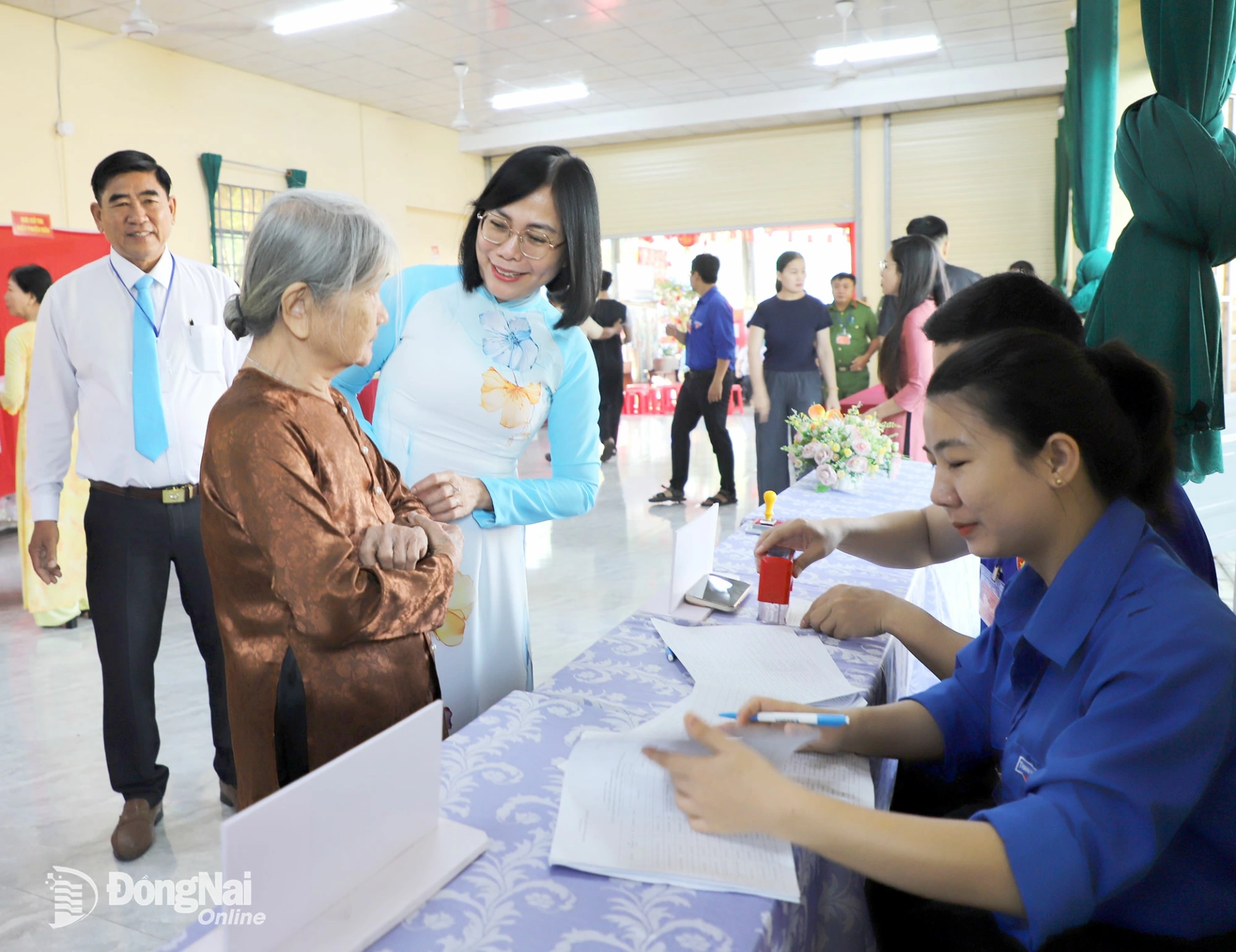 Tỉnh ủy viên, Phó Chủ tịch UBND tỉnh Nguyễn Thị Hoàng xem hướng dẫn cử tri tham gia bỏ phiếu tại khu vực bỏ phiếu số 4, khu phố Long Khánh 3. Ảnh: My Ny