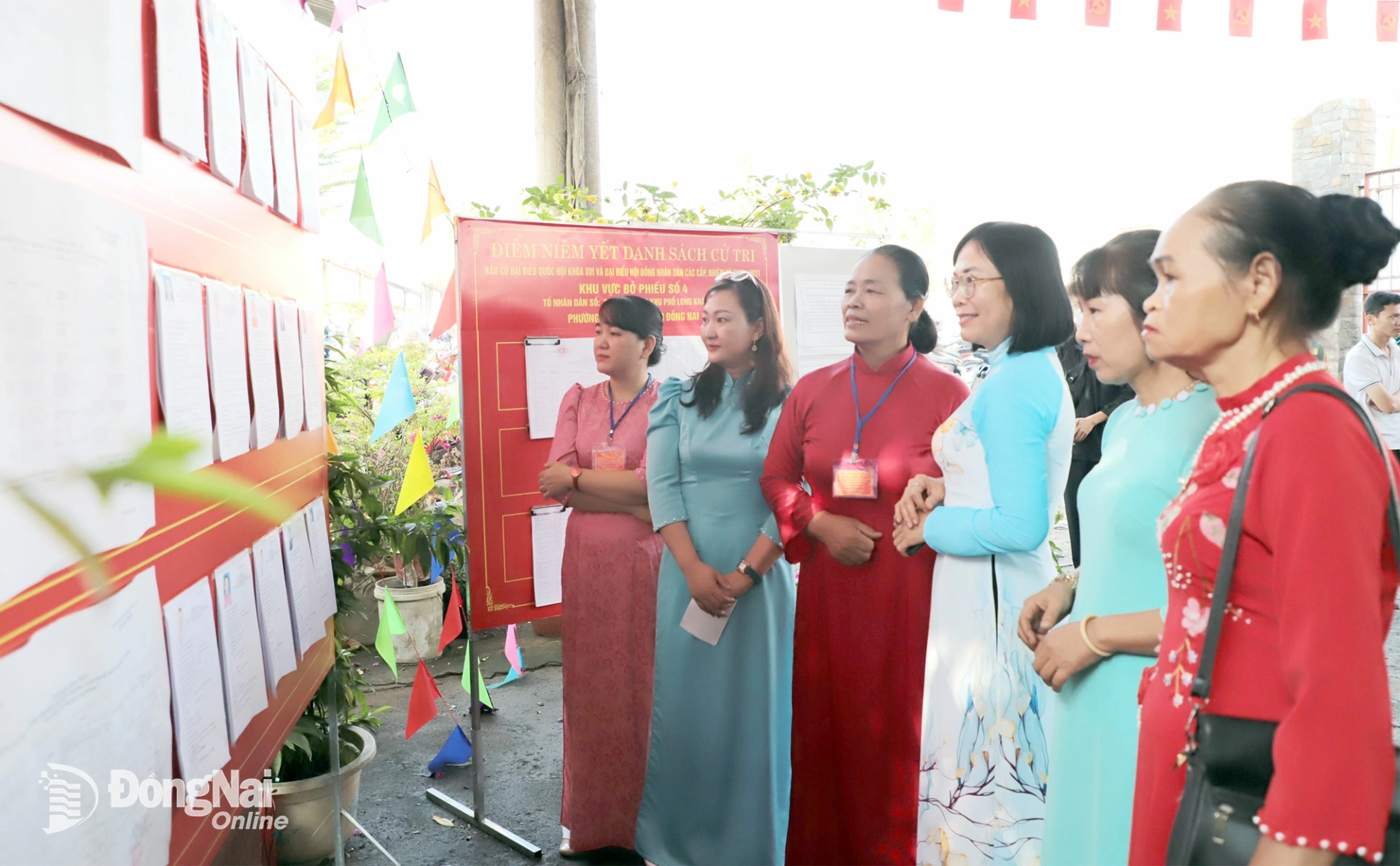 Khu vực bỏ phiếu được trang trí trang trọng với cờ, hoa; danh sách cử tri được niêm yết công khai, tạo thuận lợi dễ theo dõi.