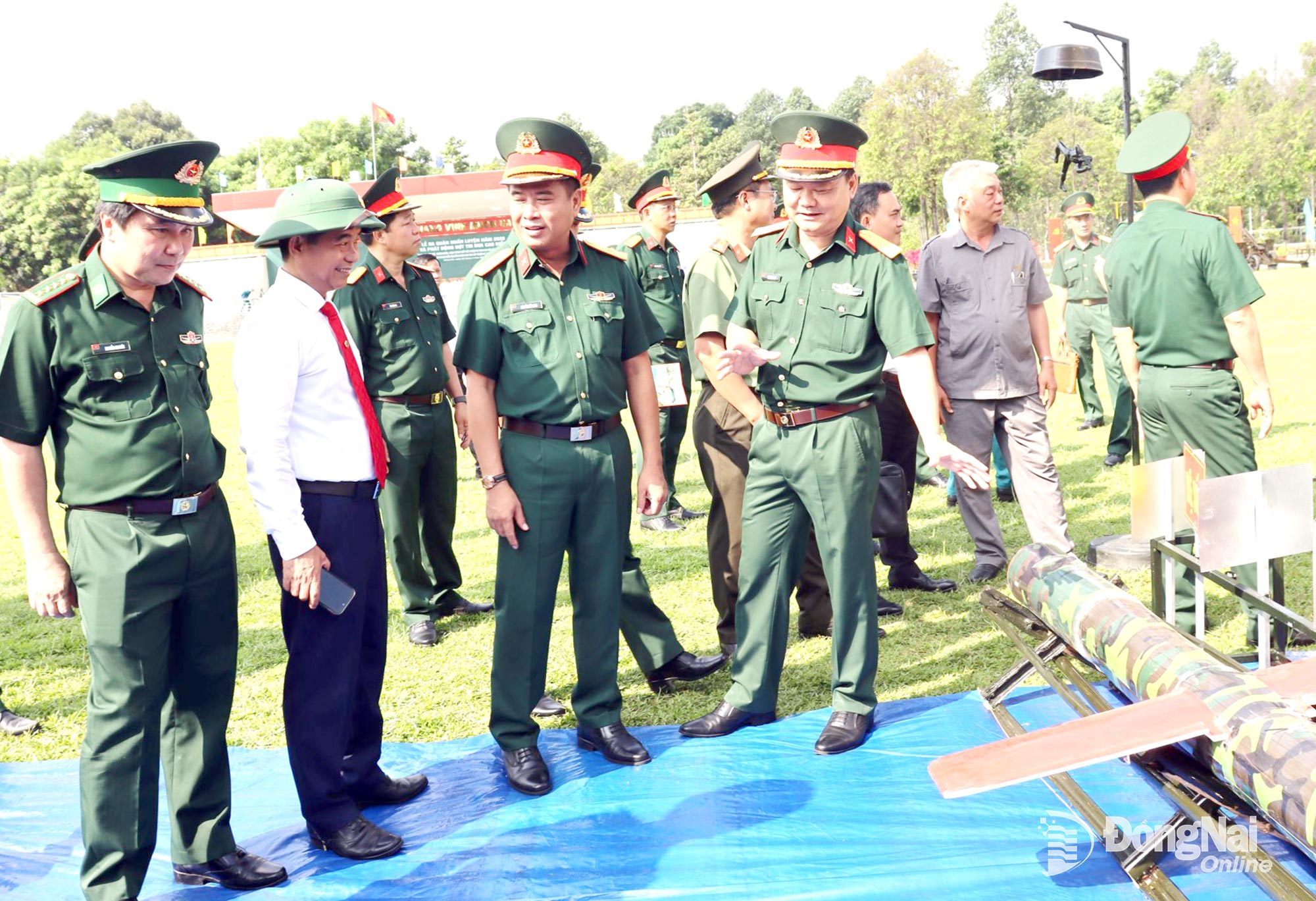 Thủ trưởng Quân khu 7, lãnh đạo tỉnh và các đại biểu tham quan mô hình học cụ trưng bày trong lễ ra quân huấn luyện. Ảnh: Nguyệt Hà