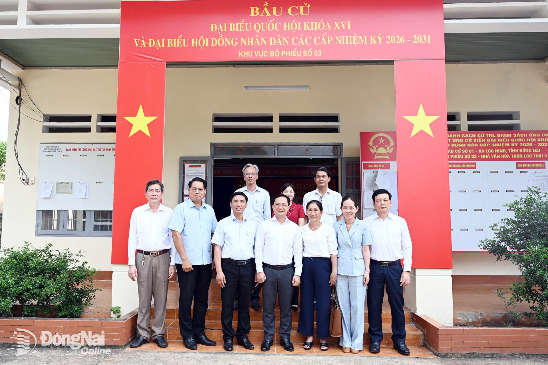 Đoàn kiểm tra công tác chuẩn bị tại khu vực bỏ phiếu số 3, xã Lộc Ninh. Ảnh: Phạm Quang