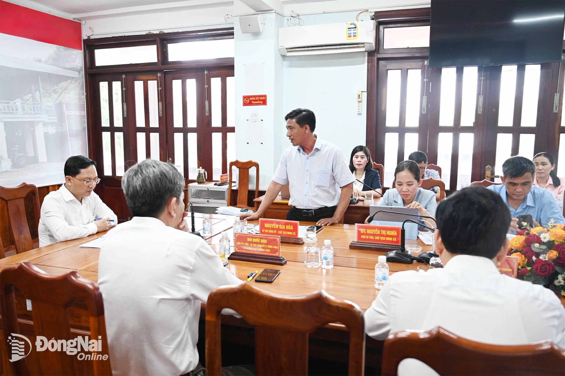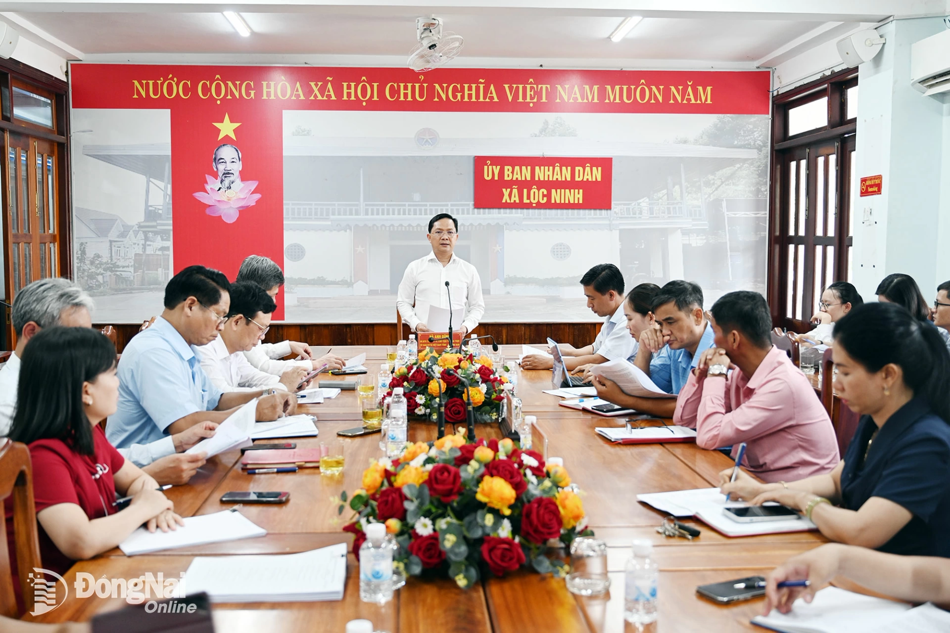 Bí thư Đảng ủy, Chủ tịch HĐND xã Lộc Ninh Nguyễn Gia Hòa báo cáo công tác chuẩn bị bầu cử của địa phương. Ảnh: Phạm Quang
