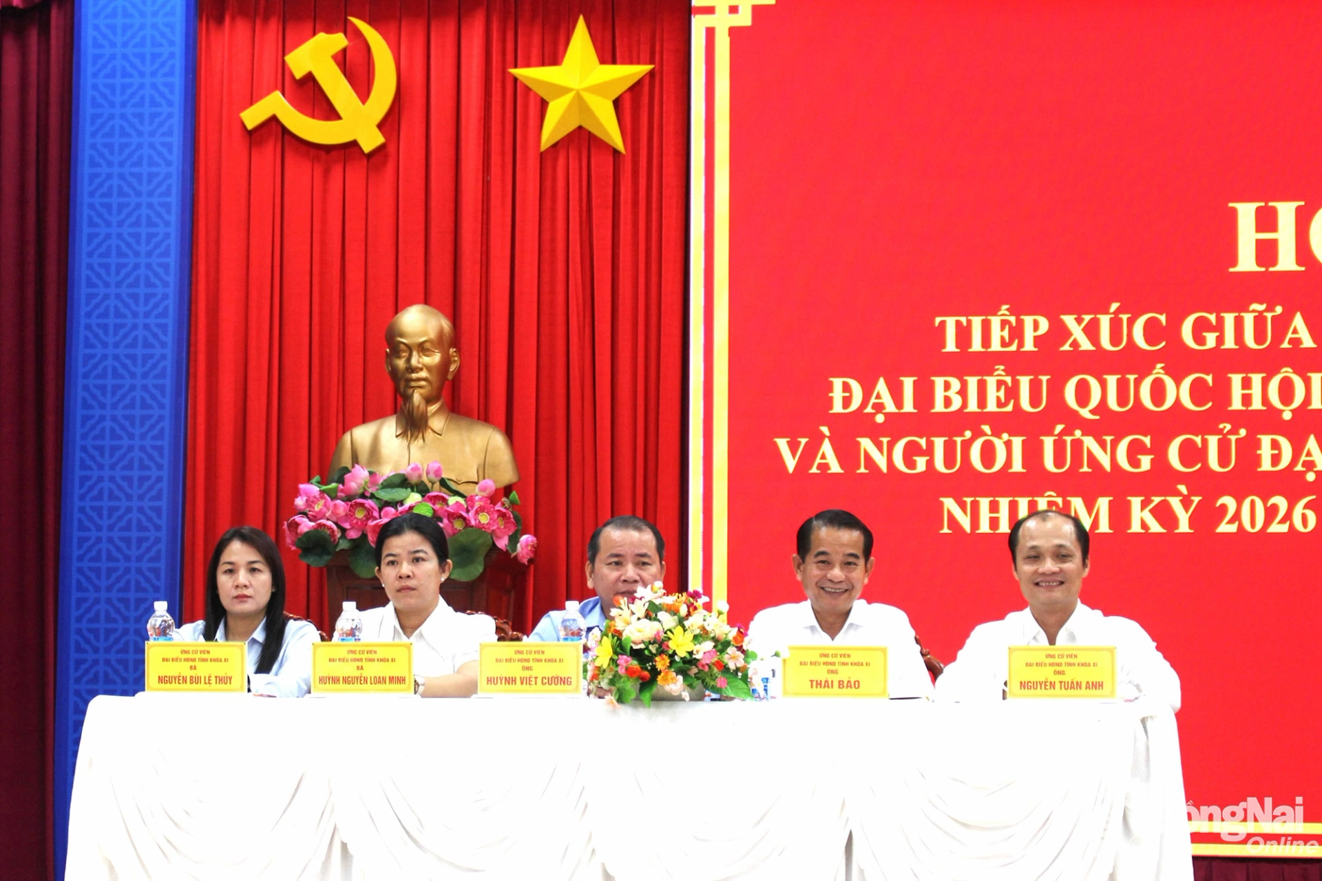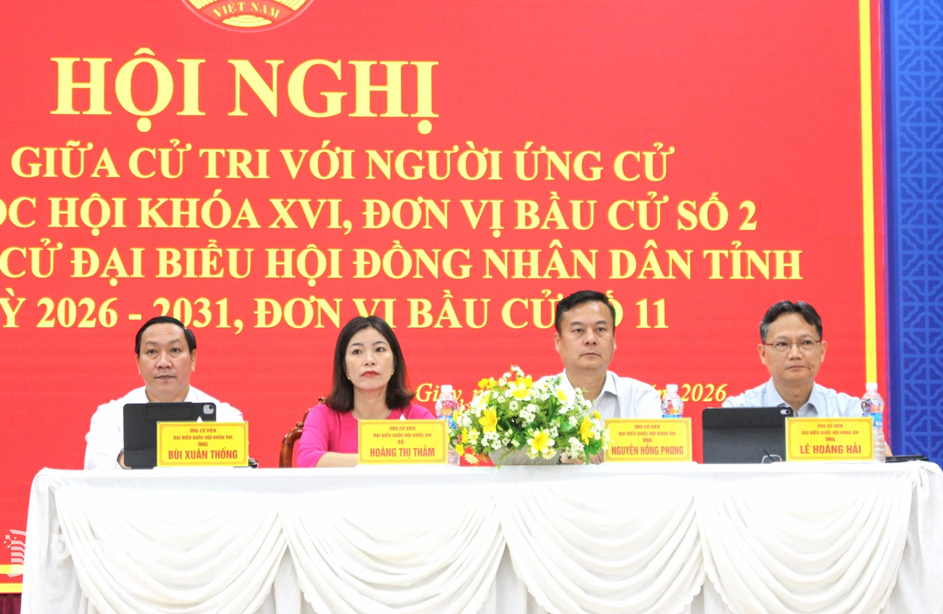 Tham dự hội nghị có các ứng cử viên đại biểu Quốc hội khóa XVI tại Đơn vị bầu cử số 2 gồm các ông, bà: Bùi Xuân Thống, Tỉnh ủy viên, Ủy viên Ban Chấp hành Đảng bộ HĐND tỉnh, Phó Trưởng đoàn chuyên trách Đoàn đại biểu Quốc hội tỉnh Đồng Nai; Lê Hoàng Hải, Đại biểu Quốc hội hoạt động chuyên trách tại Ủy ban Khoa học, Công nghệ và Môi trường của Quốc hội, Phó Chủ tịch Hội Nghị sĩ hữu nghị Việt Nam - Séc; Đặng Doãn Thành, Bí thư Đảng ủy, Chủ tịch HĐND xã Trảng Bom; Nguyễn Hồng Phong, Giám đốc Khối phát triển dự án, Công ty cổ phần Đầu tư và Kinh doanh Golf Long Thành; Hoàng Thị Thắm, chuyên viên Ủy ban MTTQ Việt Nam xã, Phó Chủ tịch Hội Nông dân xã Trảng Bom.
