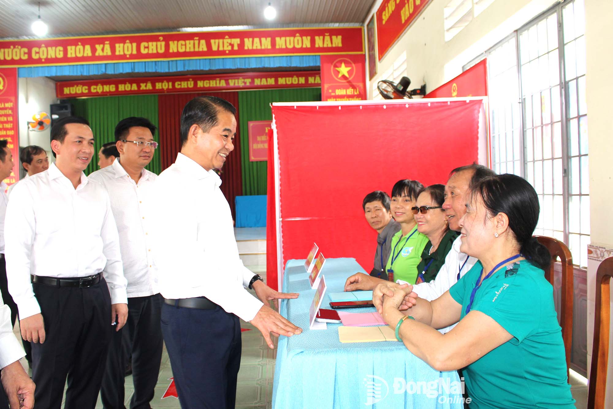 Đồng chí Thái Bảo, Phó Bí thư Tỉnh ủy, Trưởng ban Tổ chức Tỉnh ủy gặp gỡ, động viên các thành viên tổ bầu cử tại khu vực bỏ phiếu khu phố 2, phường Trảng Dài. Ảnh: Hồ Thảo