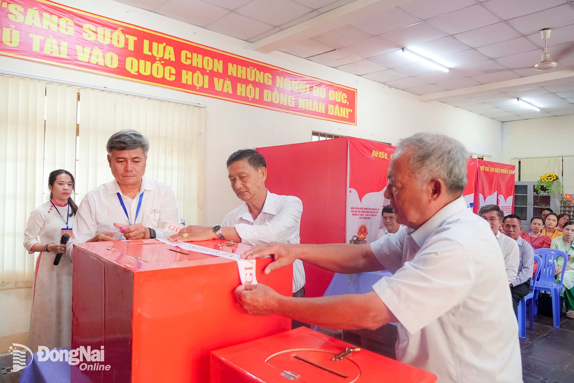 Đại diện cử tri kiểm tra, niêm phong hòm phiếu. Ảnh: Hạnh Dung