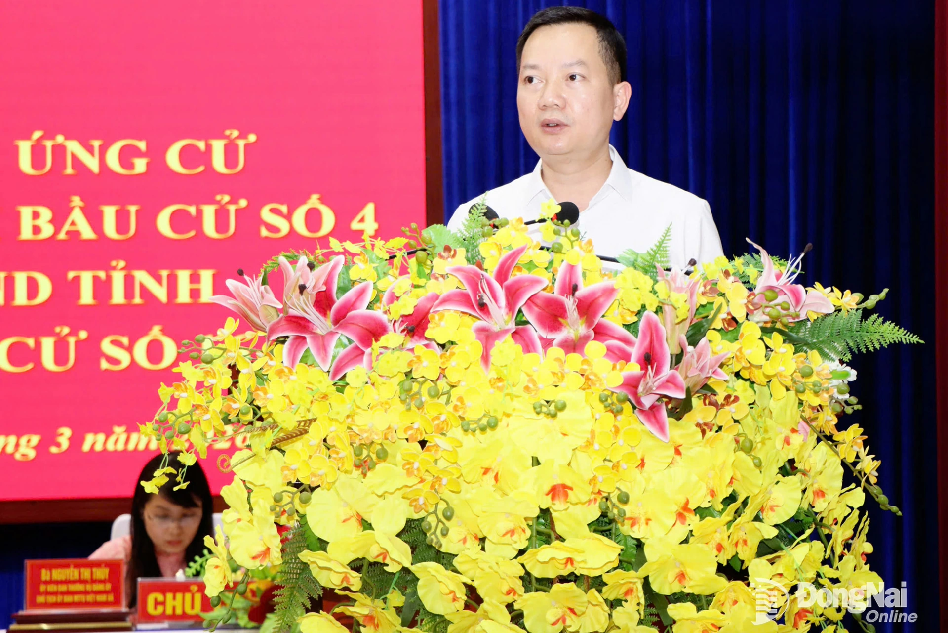 Ứng cử viên đại biểu HĐND tỉnh nhiệm kỳ 2026-2031 Hồ Văn Hà, Tỉnh ủy viên, Phó Chủ tịch UBND tỉnh trình bày chương trình hành động. Ảnh: Tuệ Lâm