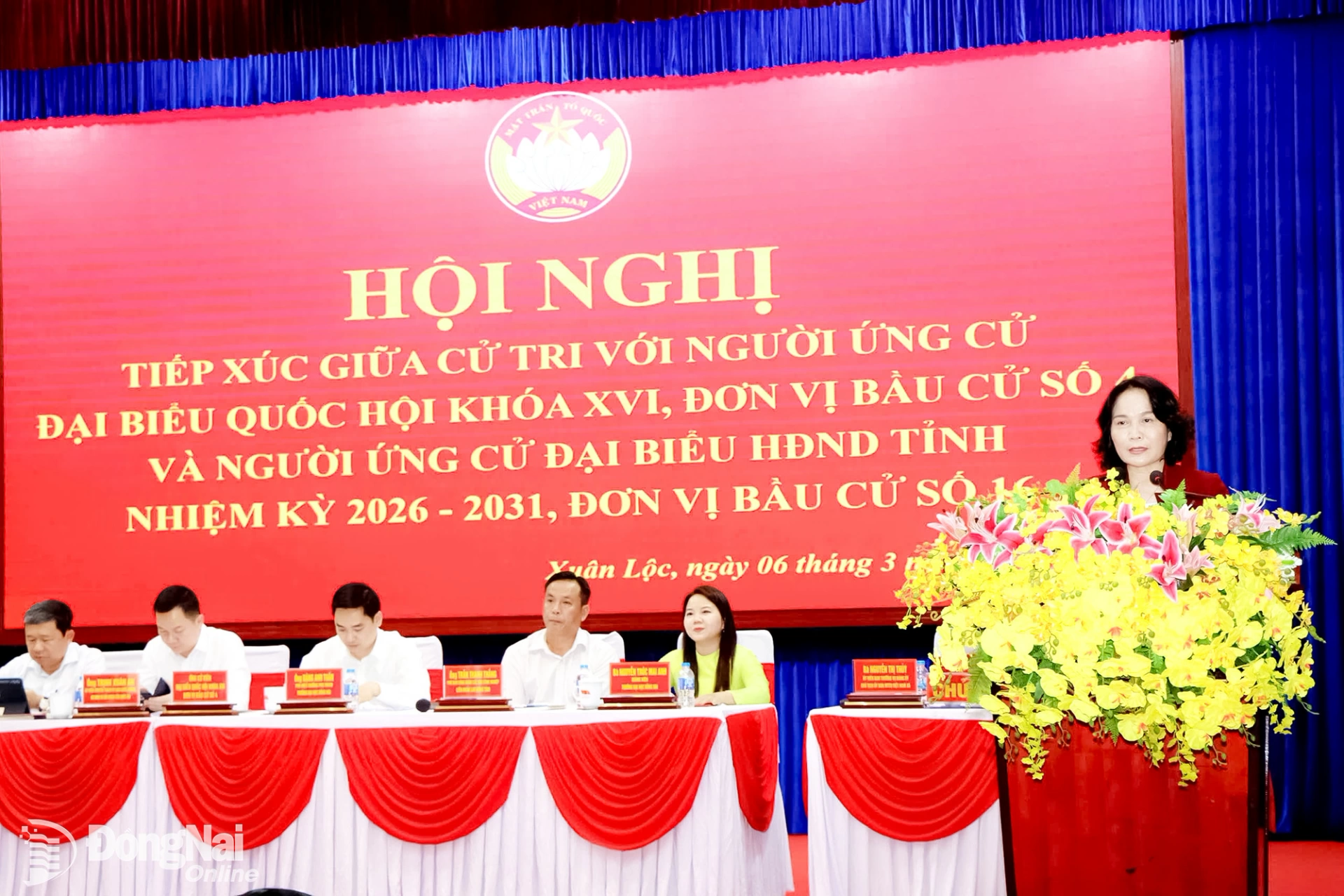 Ứng cử viên đại biểu HĐND tỉnh nhiệm kỳ 2026-2031 Nguyễn Thị Cát Tiên, Bí thư Đảng ủy, Chủ tịch HĐND xã Xuân Lộc trình bày chương trình hành động. Ảnh: Tuệ Lâm