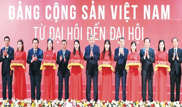 Tổng Bí thư Tô Lâm và lãnh đạo Đảng, Nhà nước cắt băng khai mạc Triển lãm "Đảng Cộng sản Việt Nam - Từ Đại hội đến Đại hội" ngày 26/12/2025. Ảnh: dangcongsan.vn