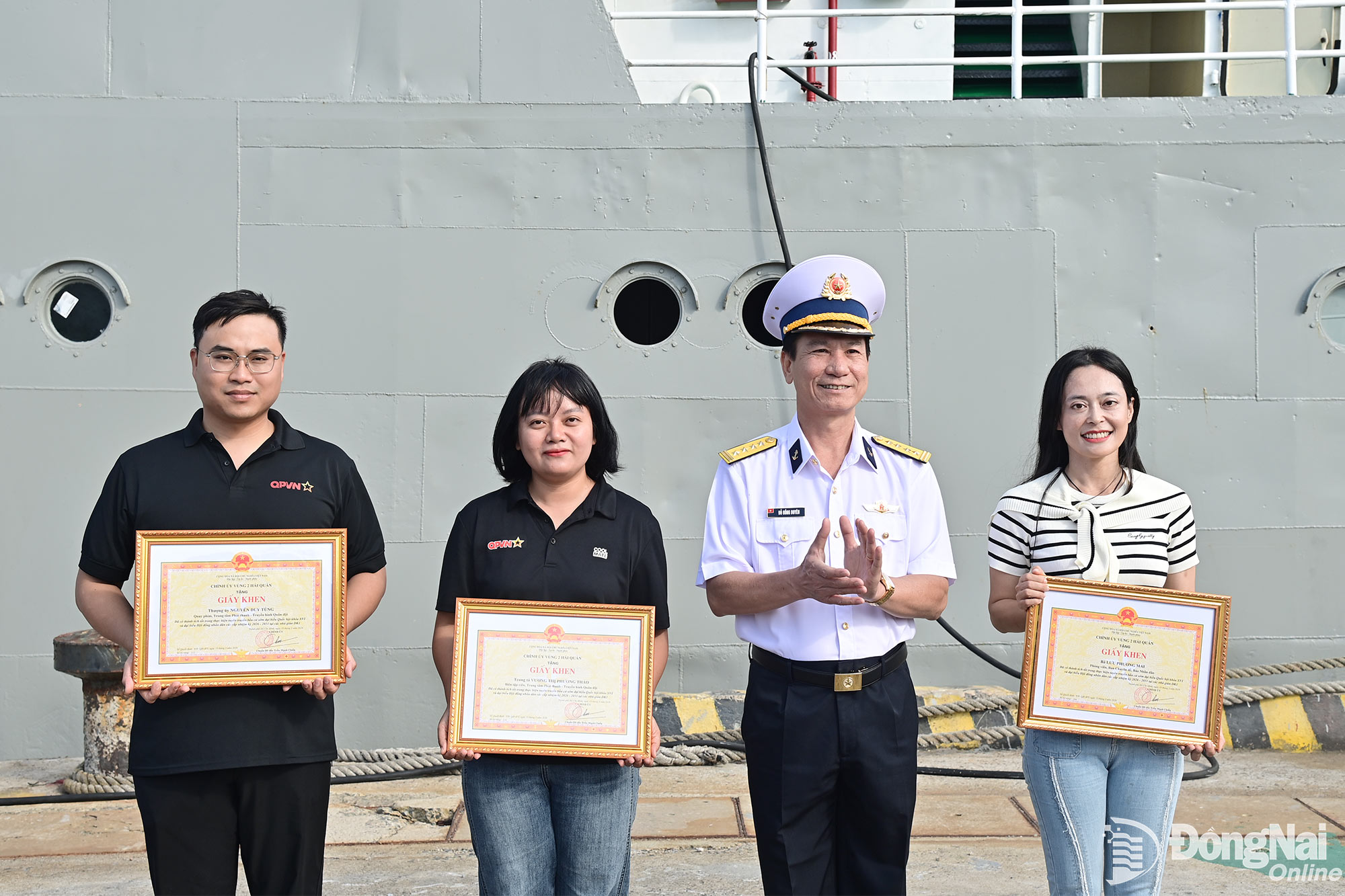 Phó Chính ủy Vùng 2 Hải quân tặng giấy khen cho các phóng viên tham gia thực hiện nhiệm vụ tuyên truyền. Ảnh: Đức Việt