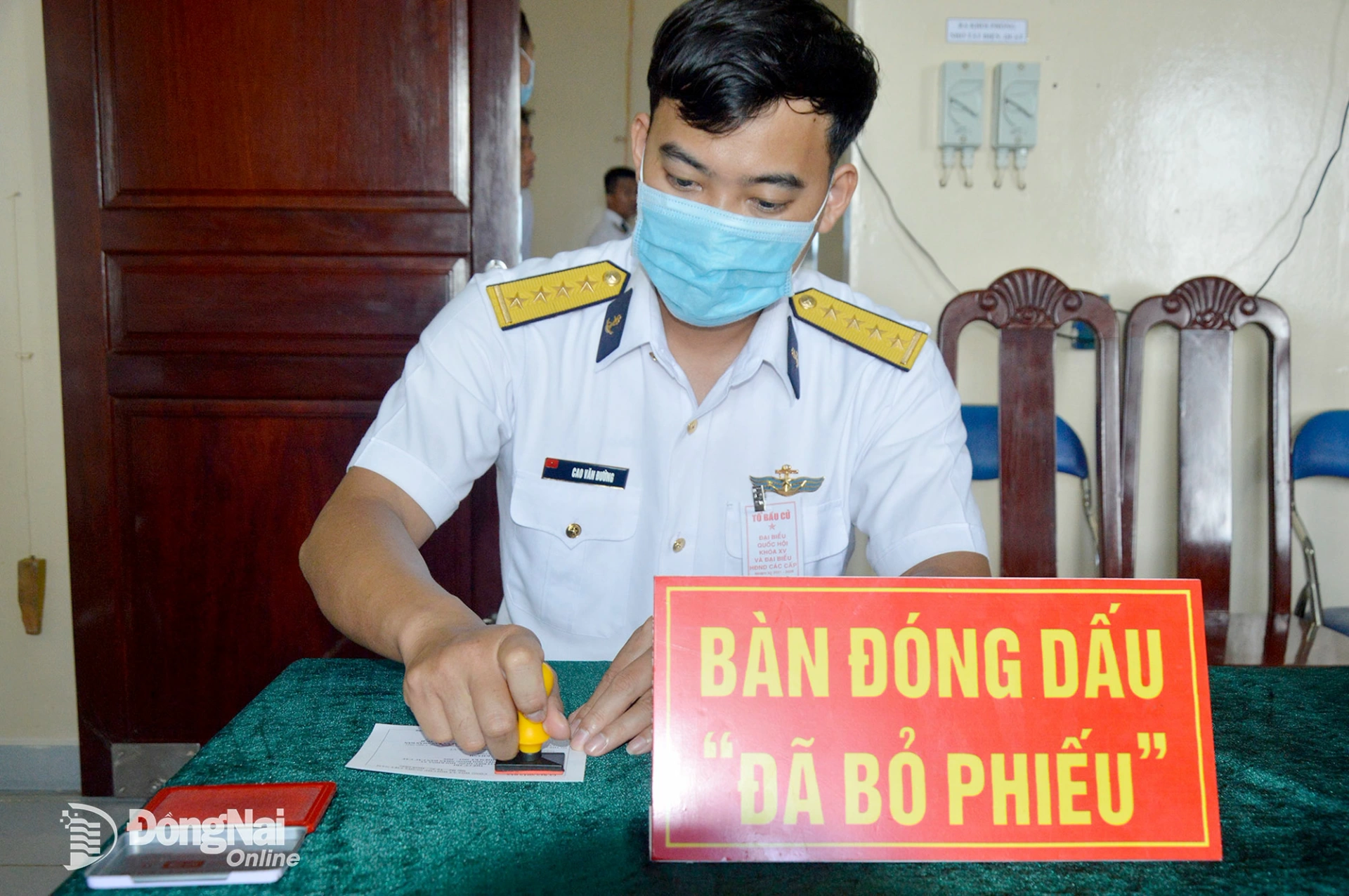 Đóng dấu “Đã bỏ phiếu” vào thẻ cử tri. Ảnh: Văn Đường